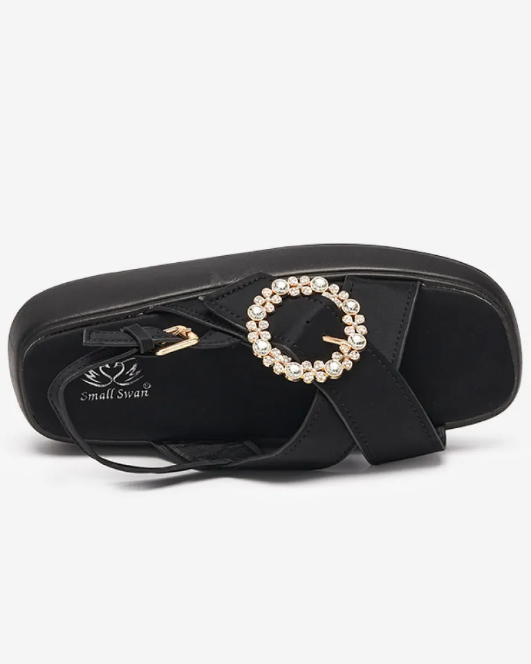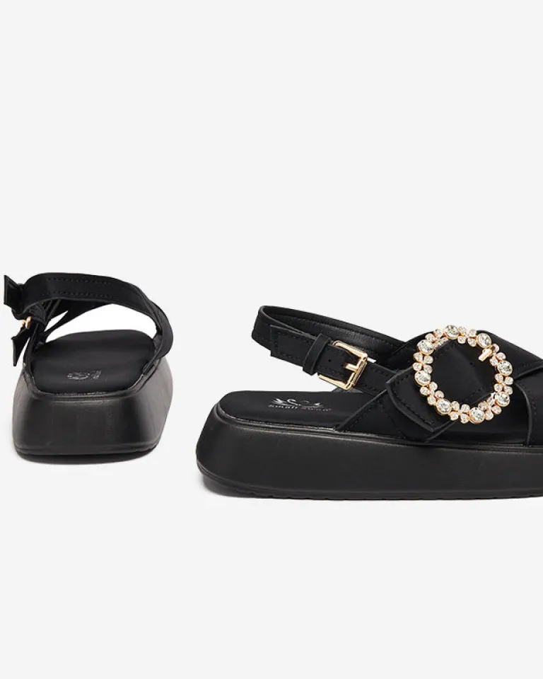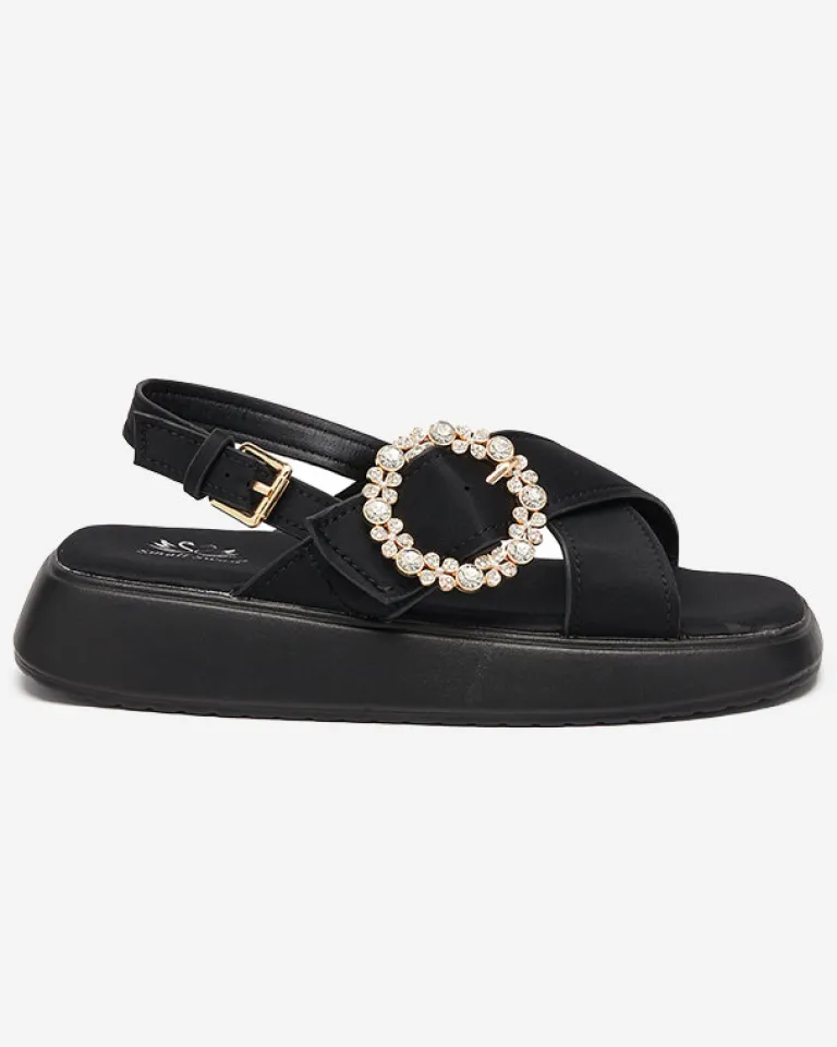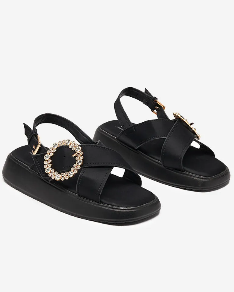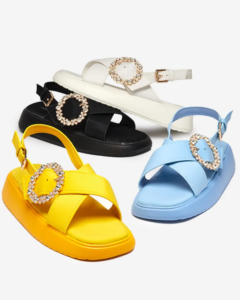- Cudowne sandały damskie na niskiej platformie. Paseczki wykonane są z połączenia tkaniny oraz skóry ekologicznej, wkładka – to materiał tkaninowy. Model zapinany na sprzączkę, posiada odkryty, kwadratowy nosek. Idealne na lato!