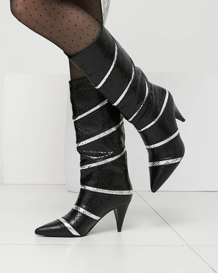 - Błyszczące damskie kozaki na szpilce wykonane z eko skóry zdobionej tłoczeniem w paski. Posiadają delikatne ocieplenie. Model wsuwany. Nosek w szpic dodaje im charakteru! CZARNO- SREBRNE DAMSKIE OCIEPLANE KOZAKI FELIFEA
