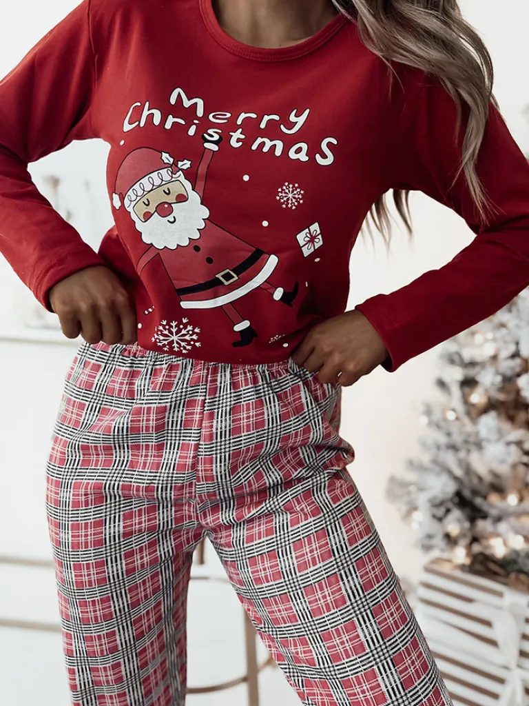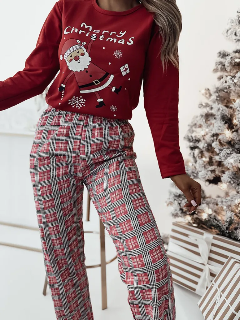 - Świąteczna damska 2-częściowa piżama wykonana z tkaniny bawełnianej wykończonej ozdobnym printem. Komplet posiada bluzkę z długimi rękawami oraz spodnie z gumą w pasie i prostymi nogawkami.