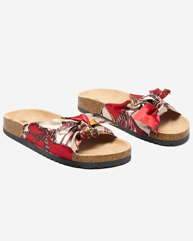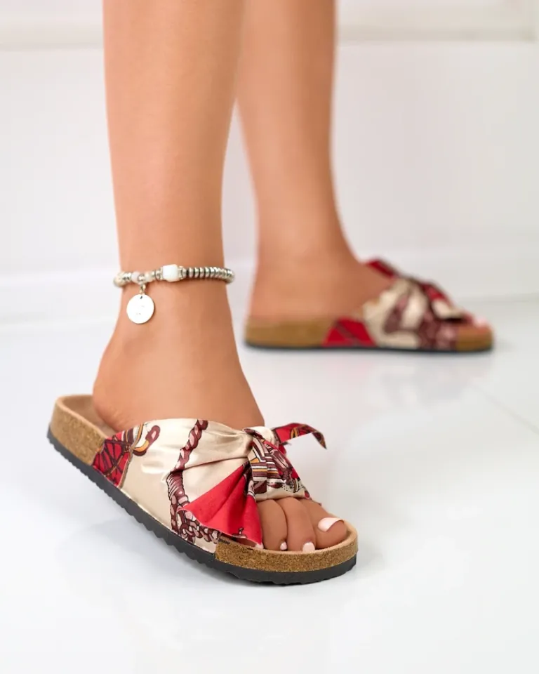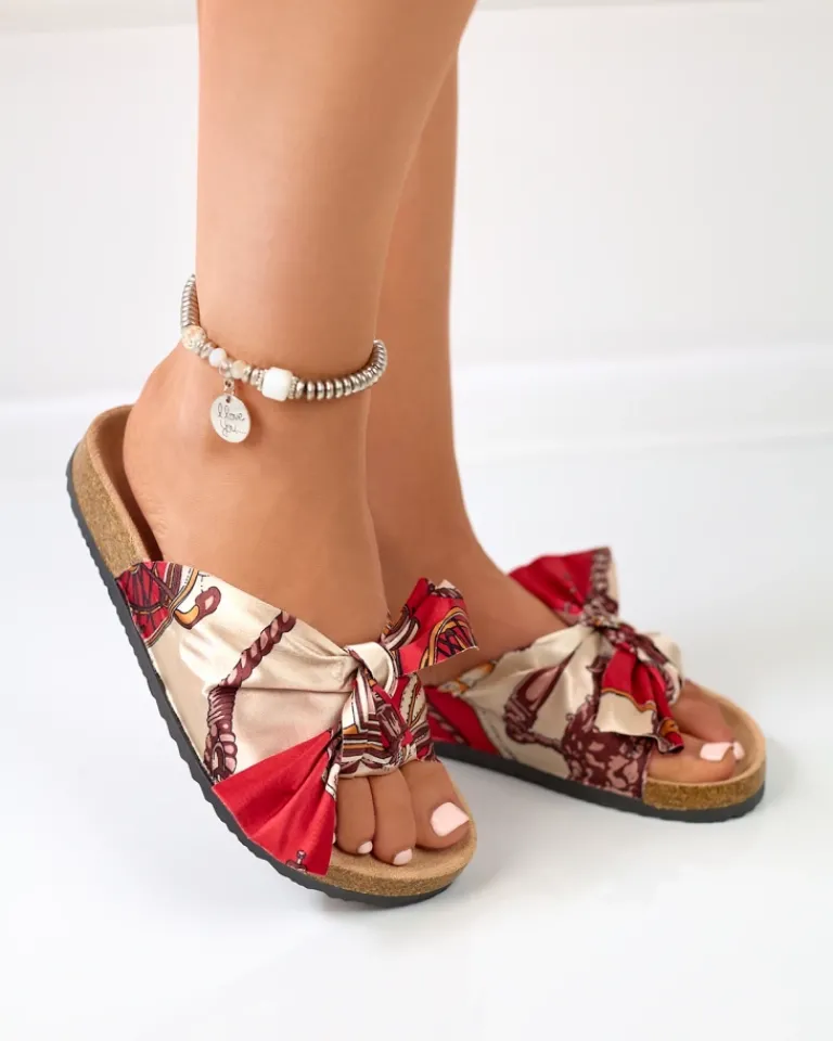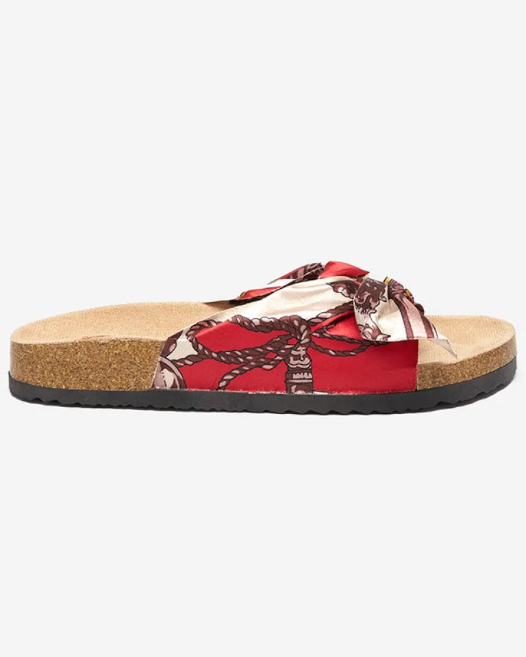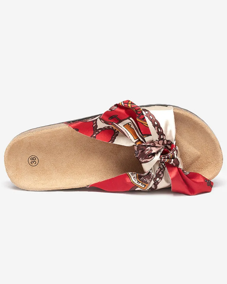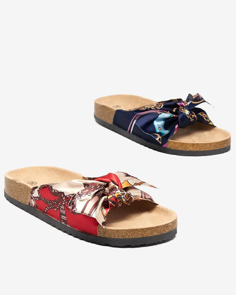 - Wygodne damskie klapki z tkaninową, wzorzystą wstążką – wkładka wykonana z eko-skóry zamszowej. Podeszwa z tworzywa sztucznego. Idealne do wakacyjnych stylizacji!