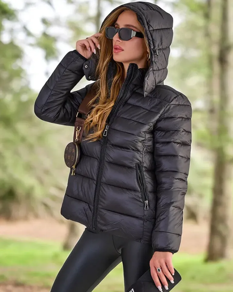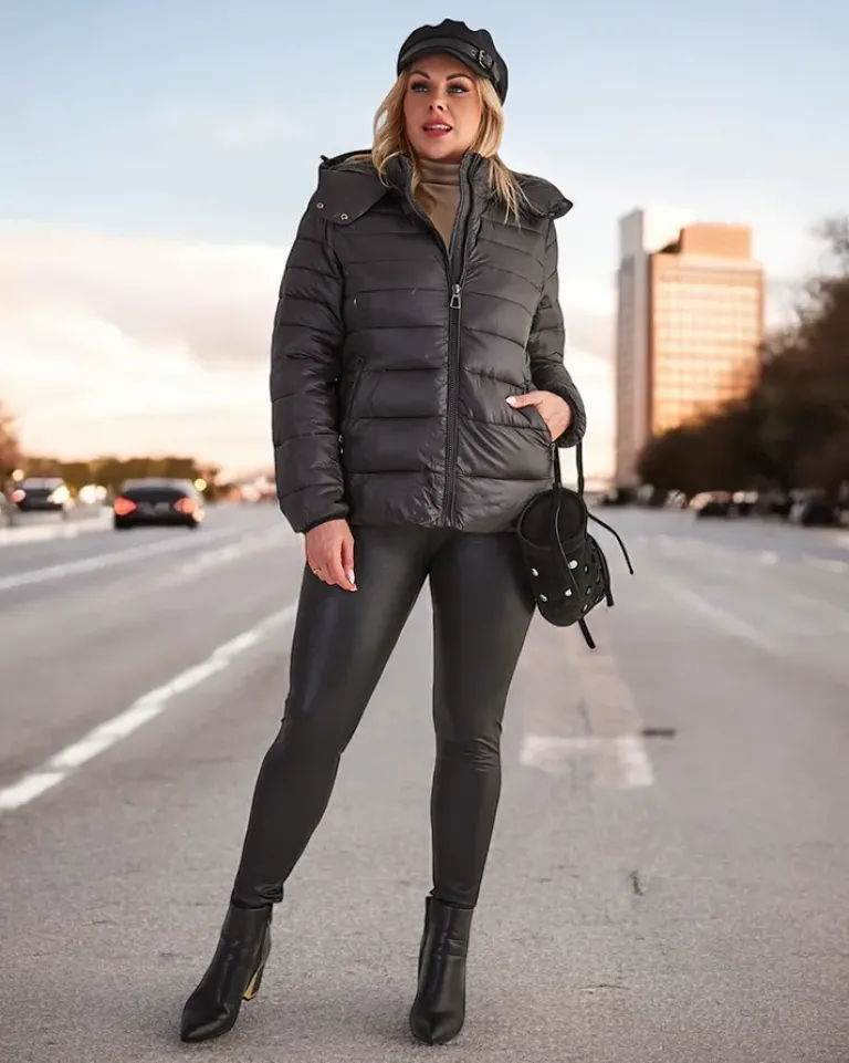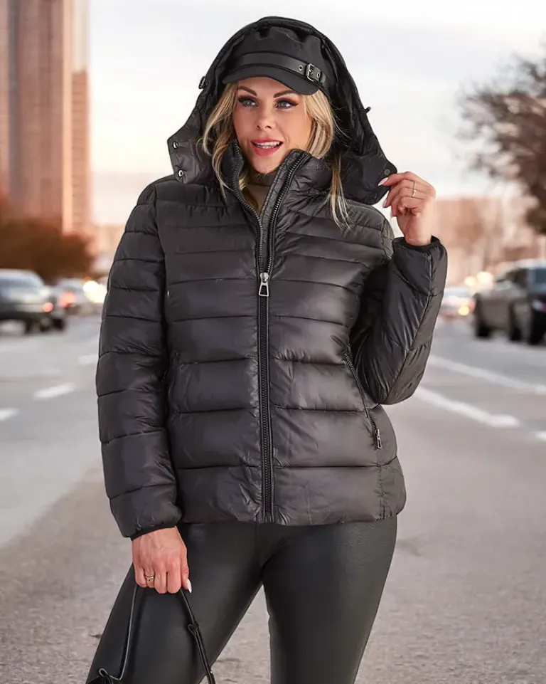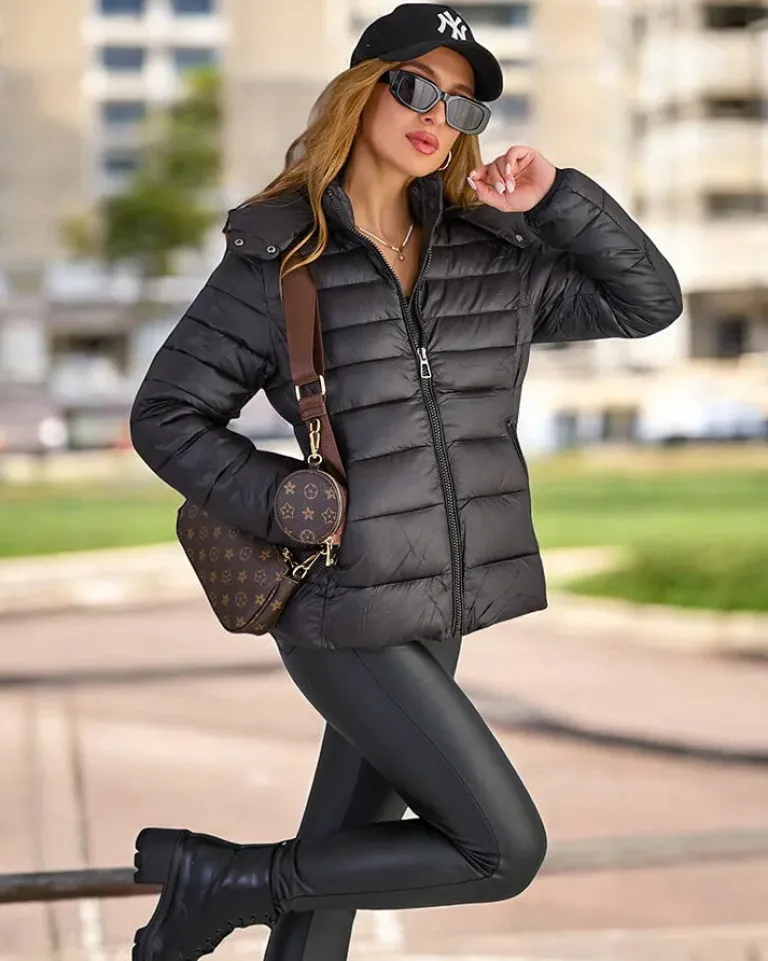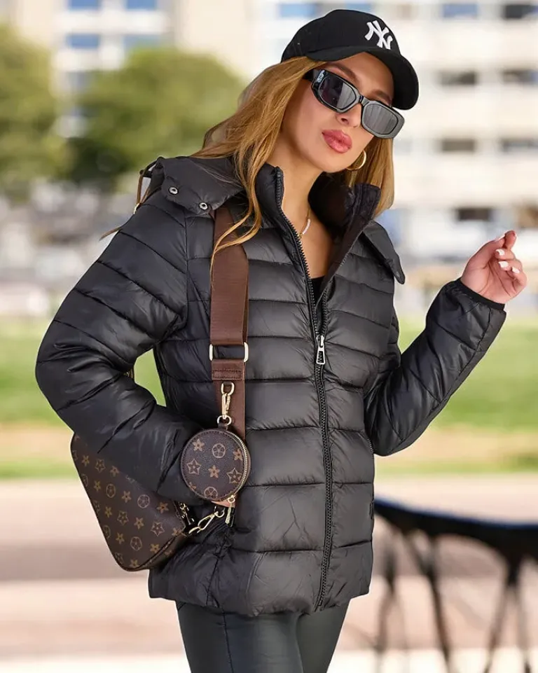 - Ciepła damska kurtka zimowa z odpinanym kapturem. Model pikowany, posiada 2 zapinane kieszenie, wypełnienie z puchu syntetycznego oraz zapięcie na suwak. UWAGA: Dokładność pomiaru (+/-) 1 cm.