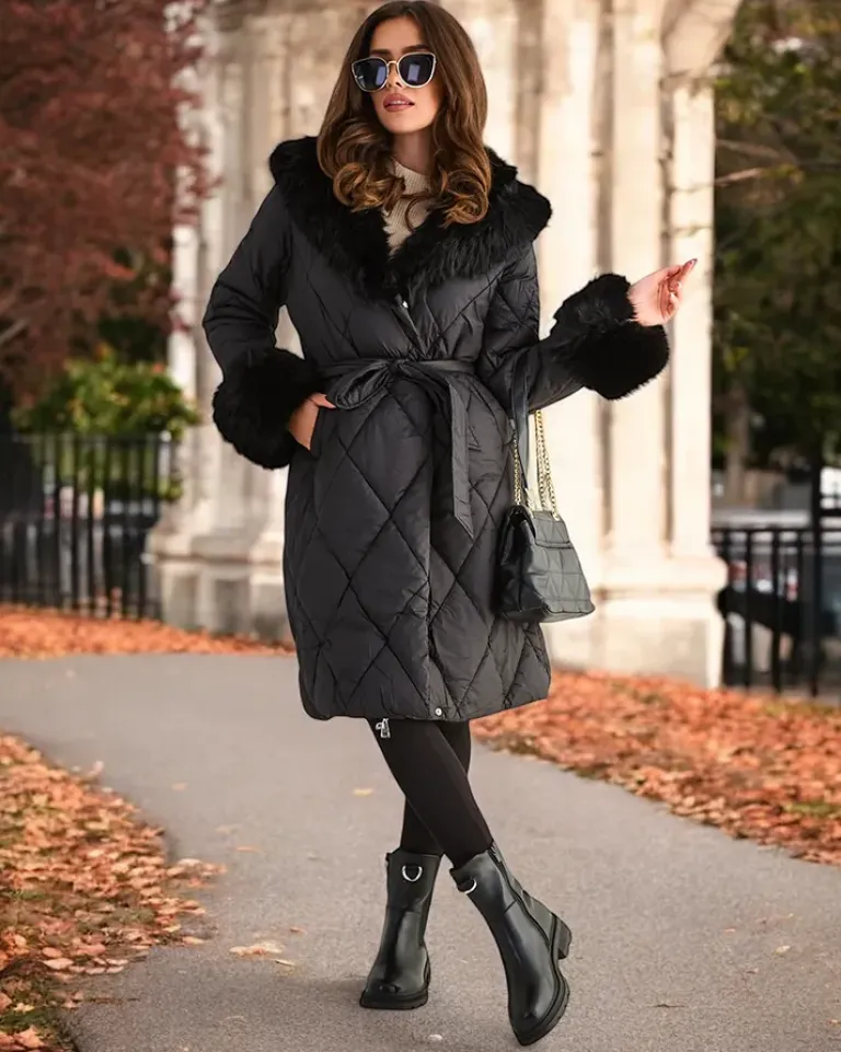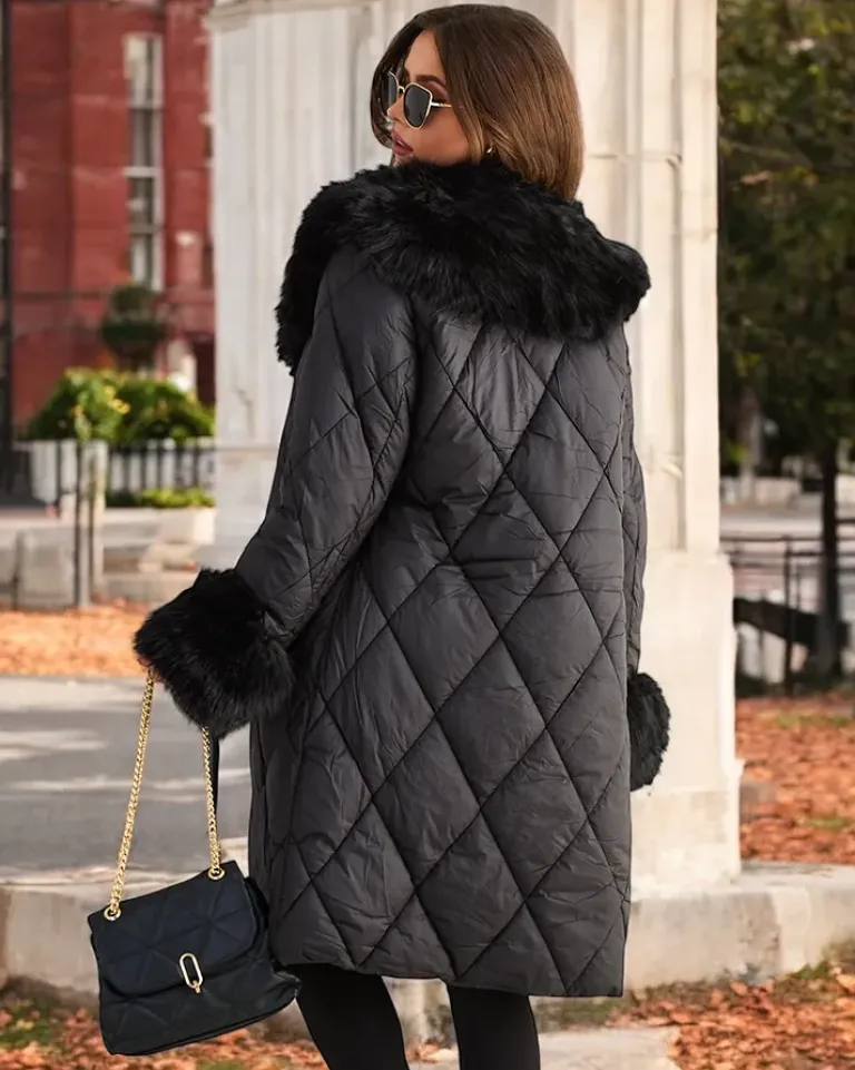 - Ciepła pikowana damska kurtka zimowa posiada kołnierz i rękawy zdobione z futerkiem oraz dwie kieszenie. Kurtka zapinana na zamek i zatrzaski. Model wypełniony puchem syntetycznym. Idealna na zimę!