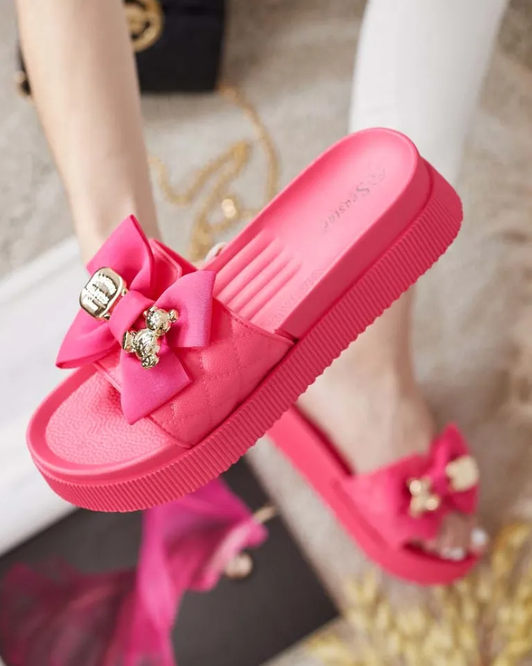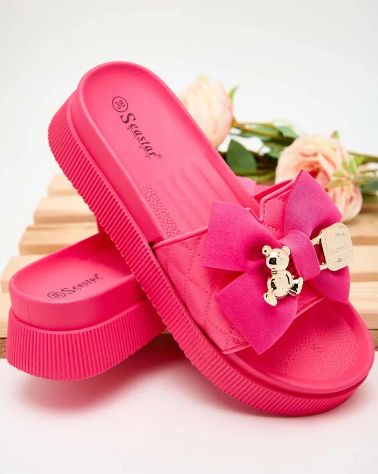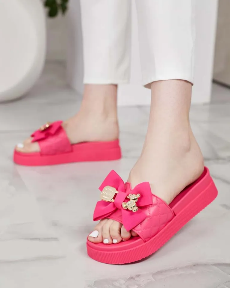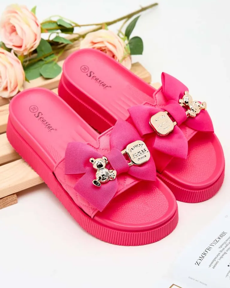 - Świetne damskie klapki na płaskiej podeszwie, zdobione kokardką i zdejmowanymi złotymi ozdobami. Materiał wykonania to skóra ekologiczna łączona z grubszą, gumową podeszwą. Idealny wybór na wakacje!