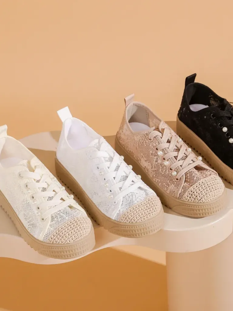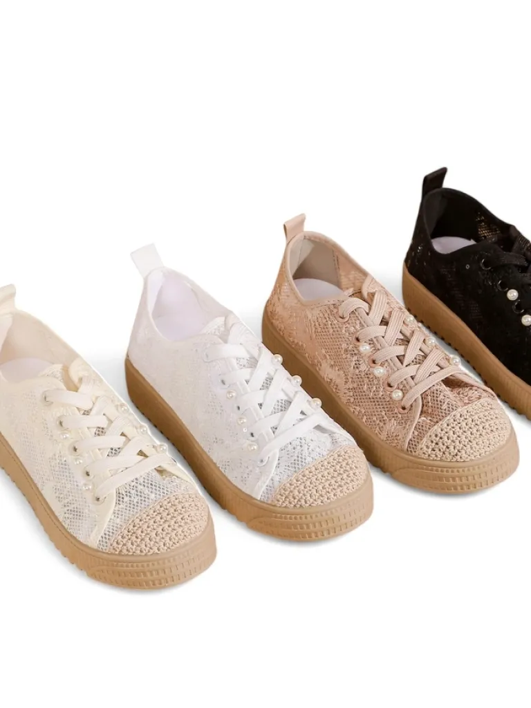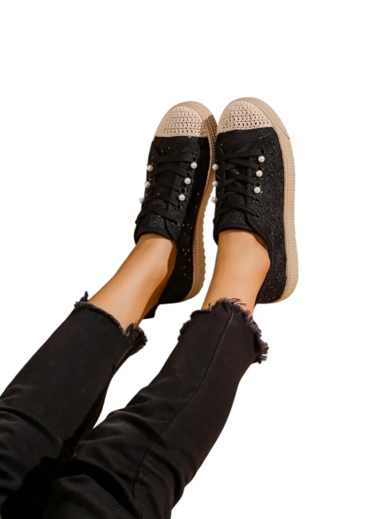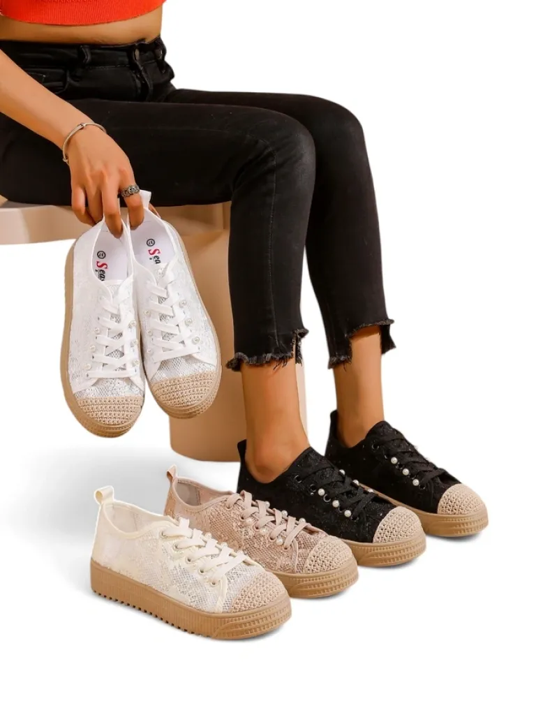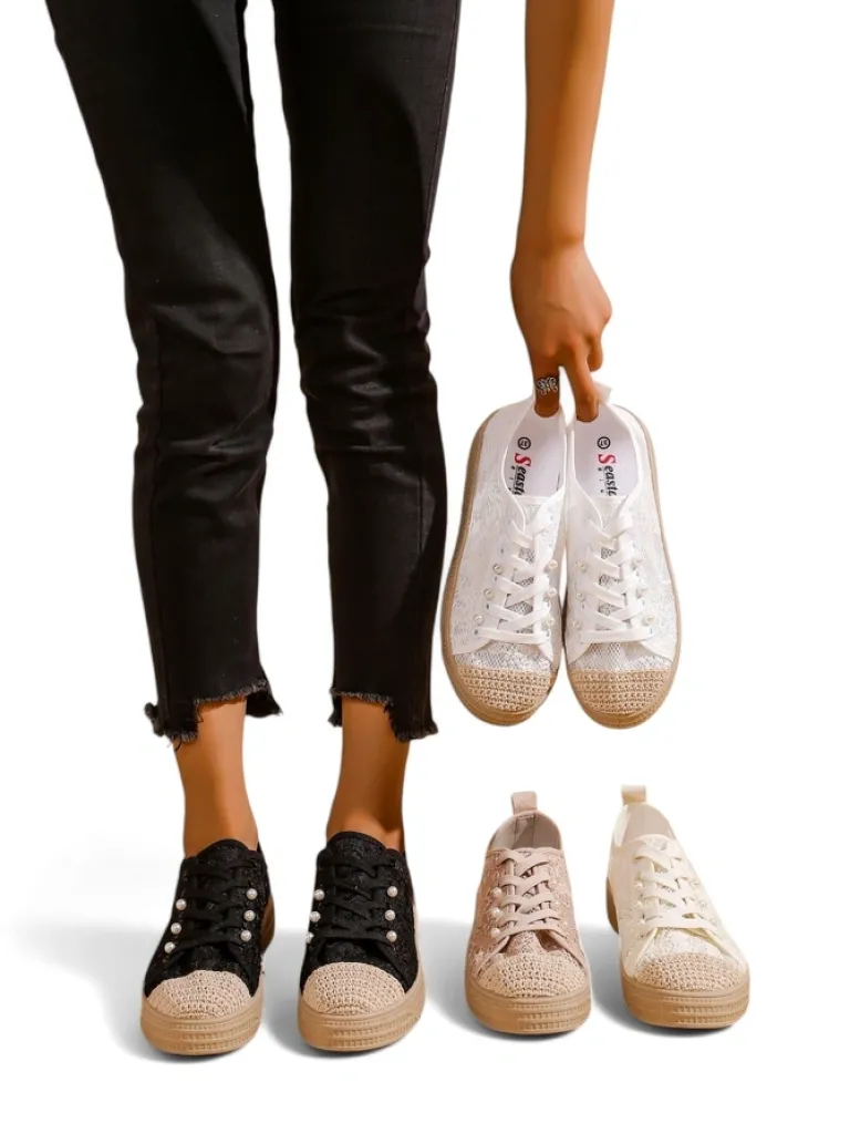 - Damskie buty na płaskiej podeszwie. Para w stylu casual jest wykonana z materiału tkaninowego z koronkowym wykończeniem, wkładka tkaninowa. Model posiada ozdobne cekiny. Idealne dla tych, którzy cenią komfort!