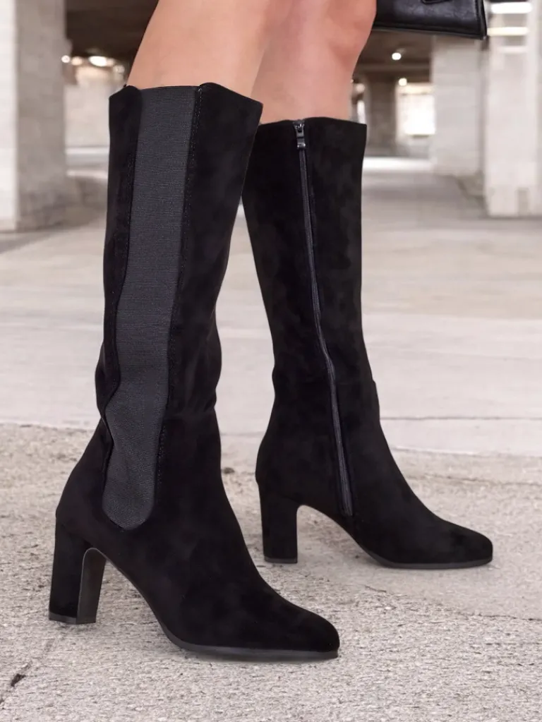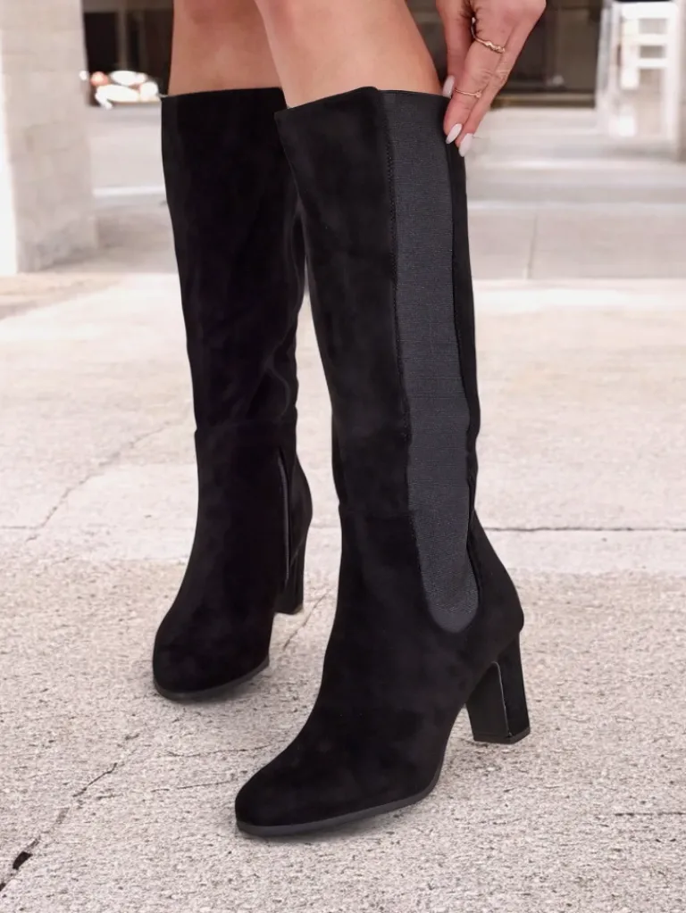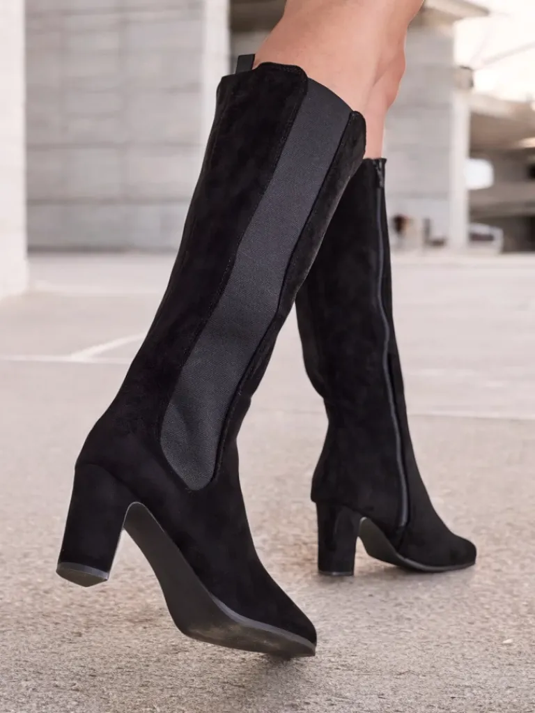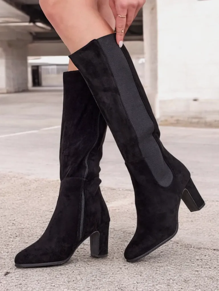 - Wysokie damskie kozaki wykonane z zamszowej skóry ekologicznej na słupku. Środek tkaninowy z eko skórzaną wkładką. Model zapinany na suwak i posiada elastyczną wstawkę z boku. Eleganckie i stylowe!