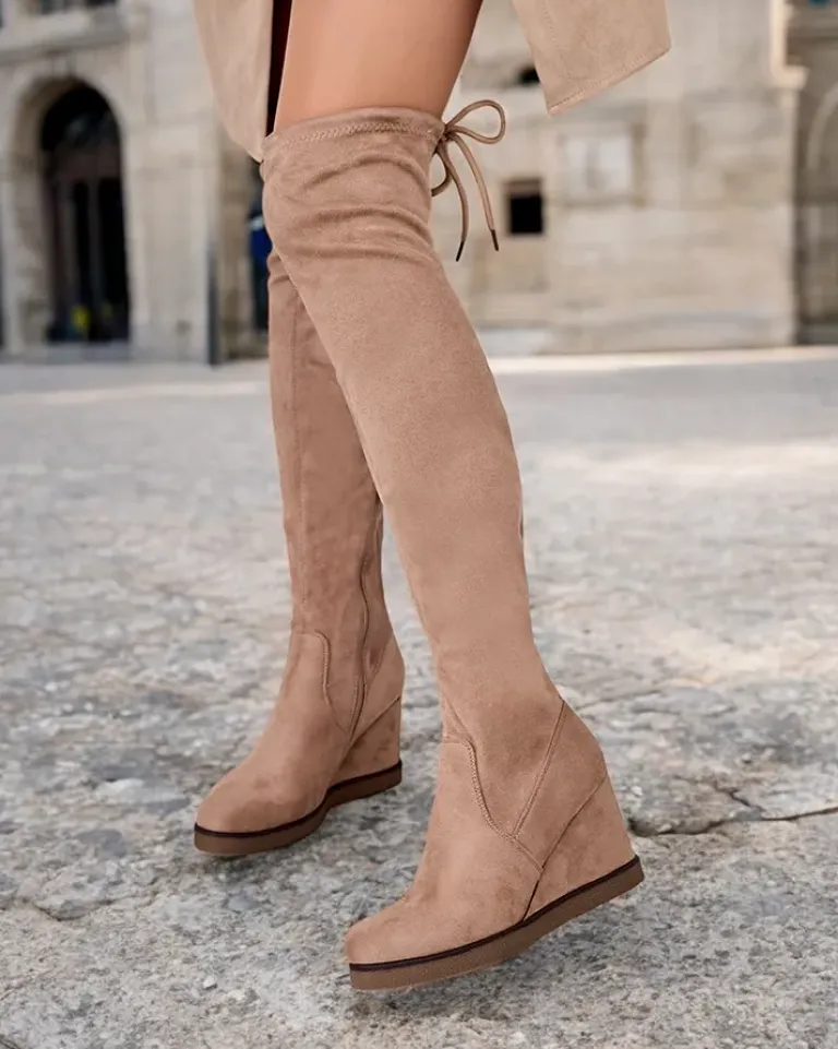 - Długie damskie kozaki na grubszej podeszwie, cholewka wykonana z eko-zamszu. Buty są zapinane na suwak na wysokości kostki. Model na koturnie. Idealna baza dla wielu letnich outfitów!