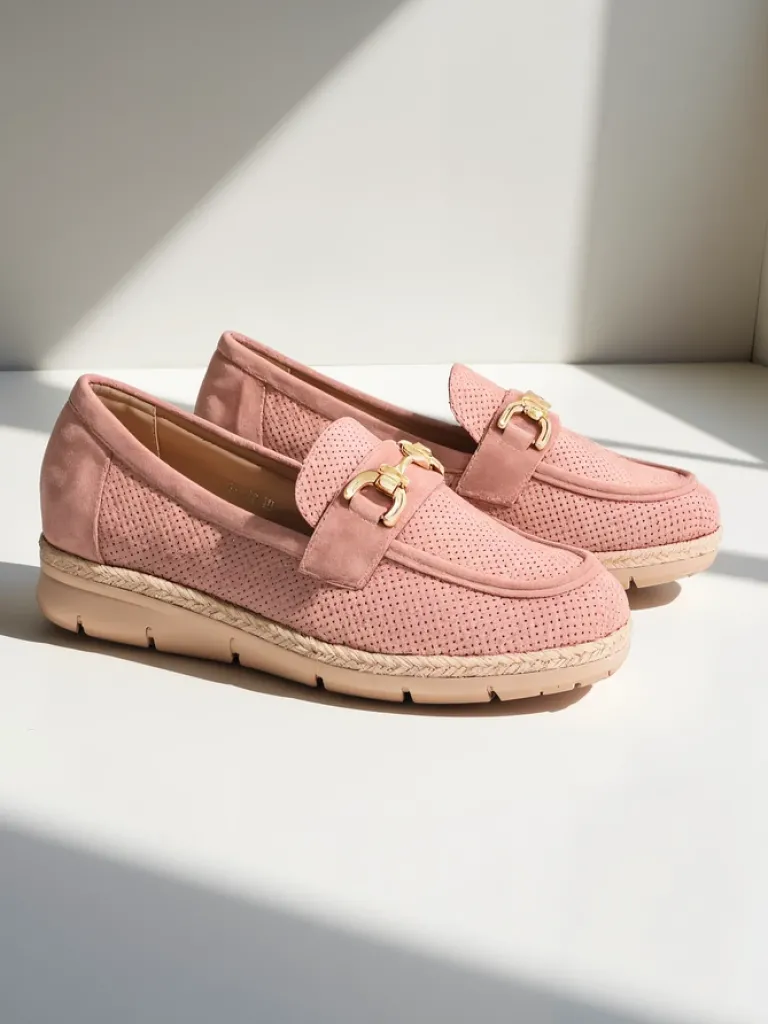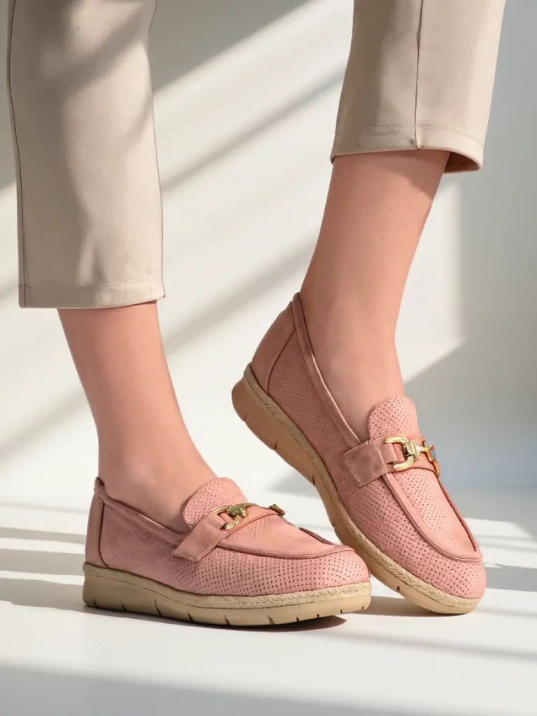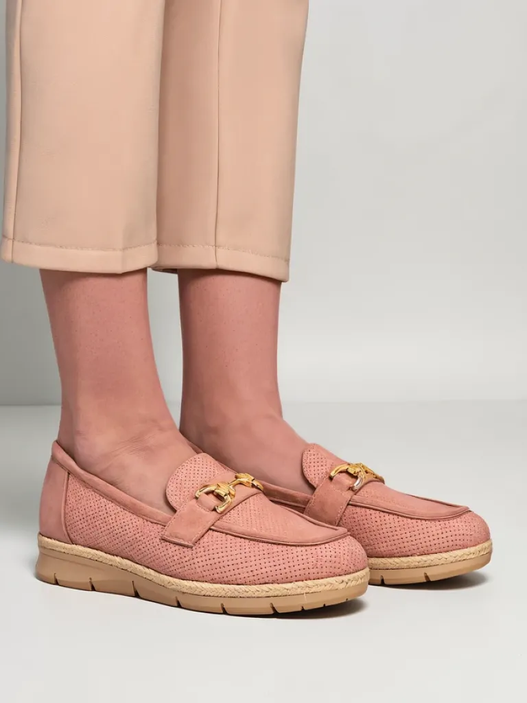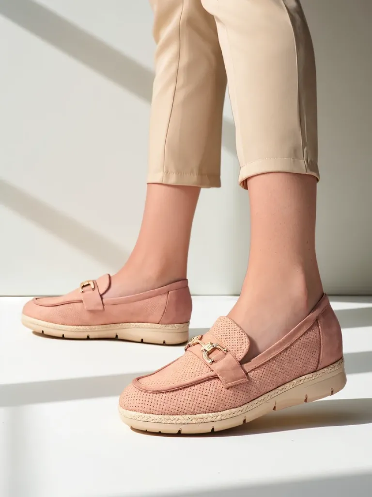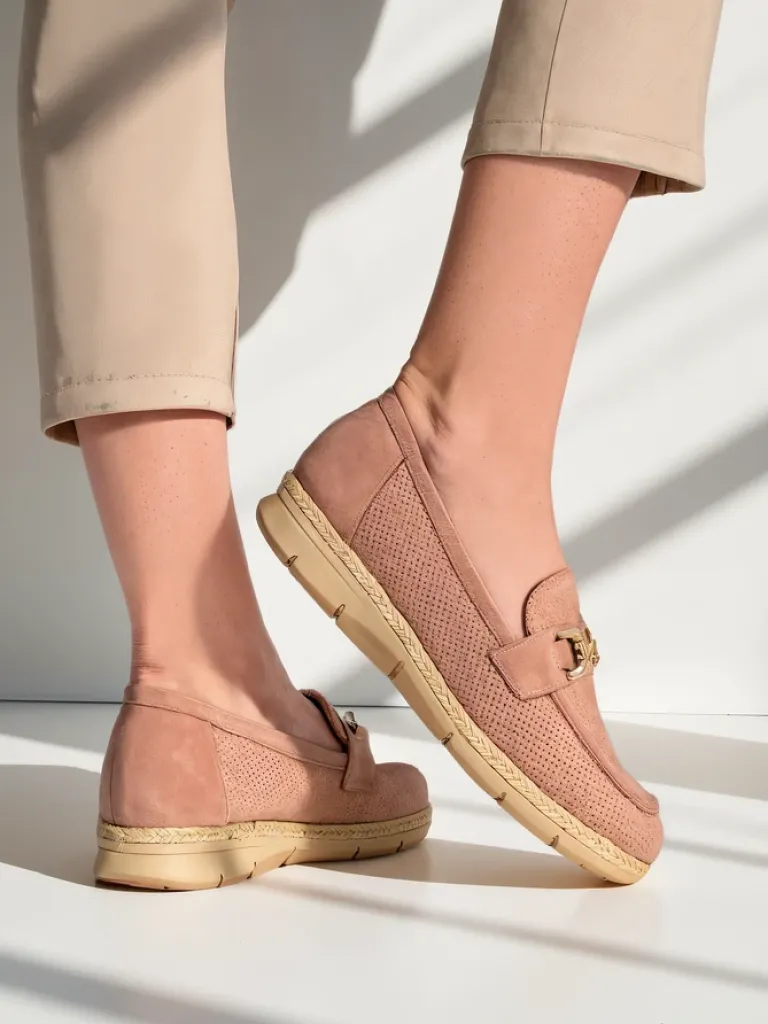 - Klasyczne damskie półbuty na płaskiej podeszwie. Model wykonany ze skóry ekologicznej zamszowej oraz eko skórzanej wkładki. Nosek zdobiony subtelną ozdobą. Must have w szafie każdej kobiety!