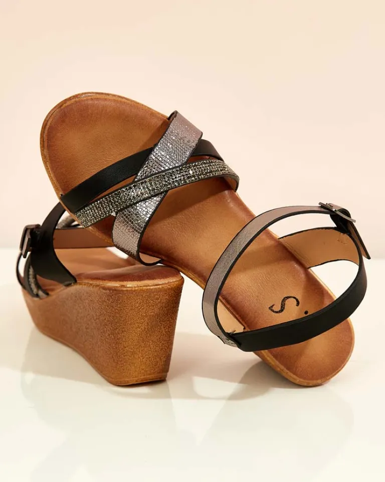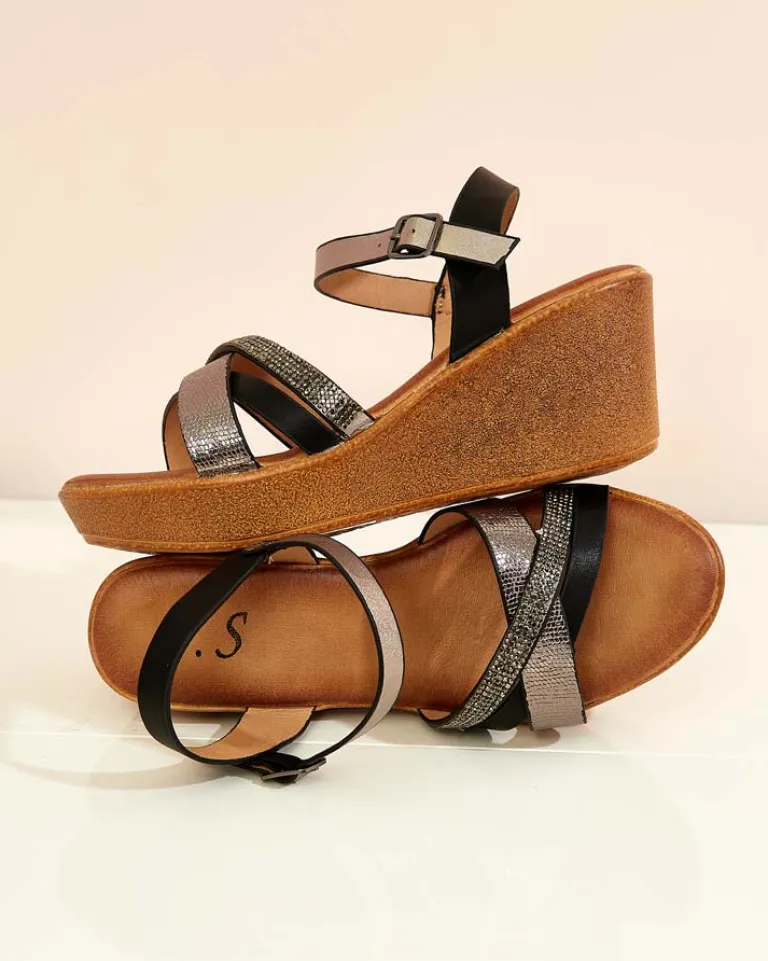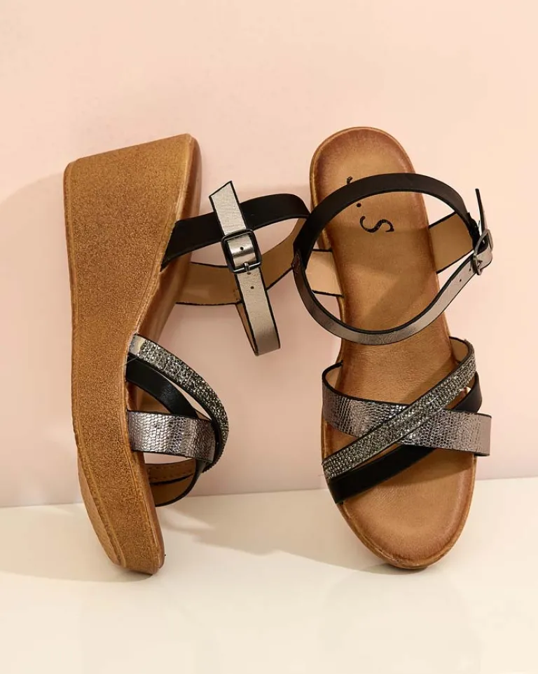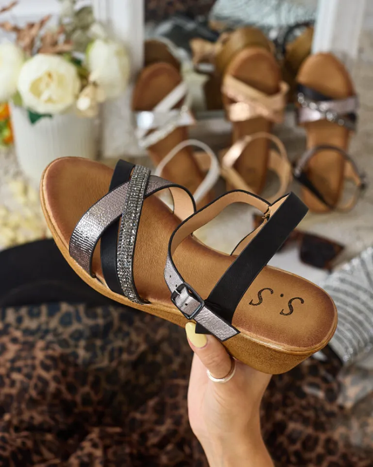- Damskie sandałki na niskim koturnie- to idealny pomysł na gorące letnie dni. Model całościowo wykonany ze skóry ekologicznej. Cholewka udekorowana ozdobnymi cyrkoniami. Załóż je do krótkich spodenek!