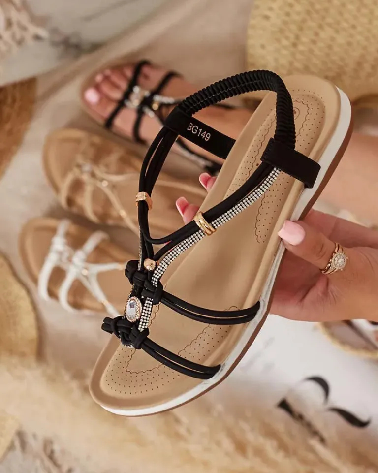 - Damskie sandałki na płaskiej podeszwie – to idealny pomysł na gorące letnie dni. Model całościowo wykonany ze skóry ekologicznej. Cholewka udekorowana dżetami i ozdobnymi cyrkoniami.