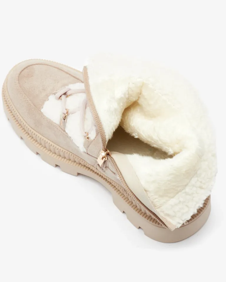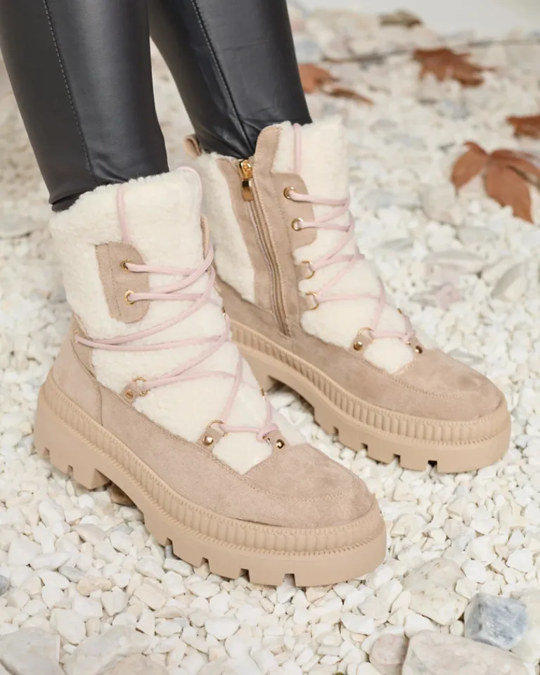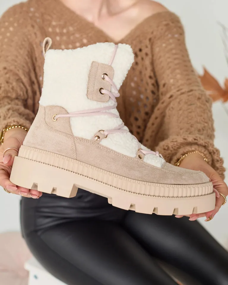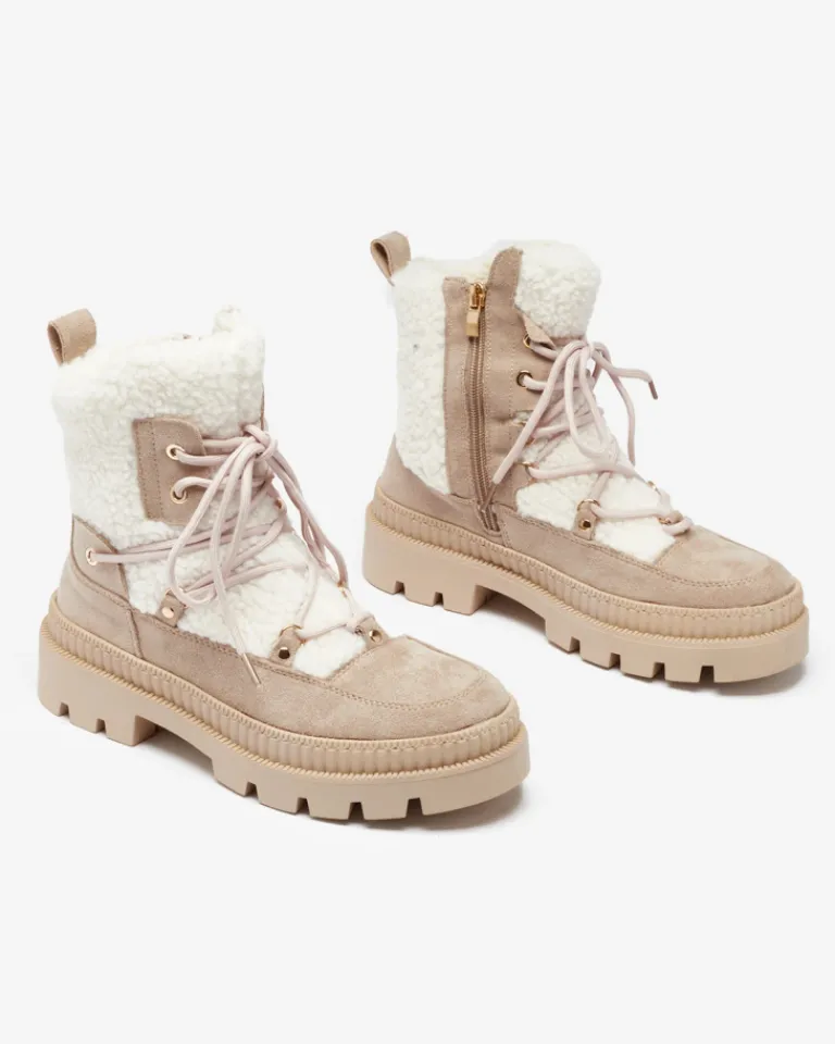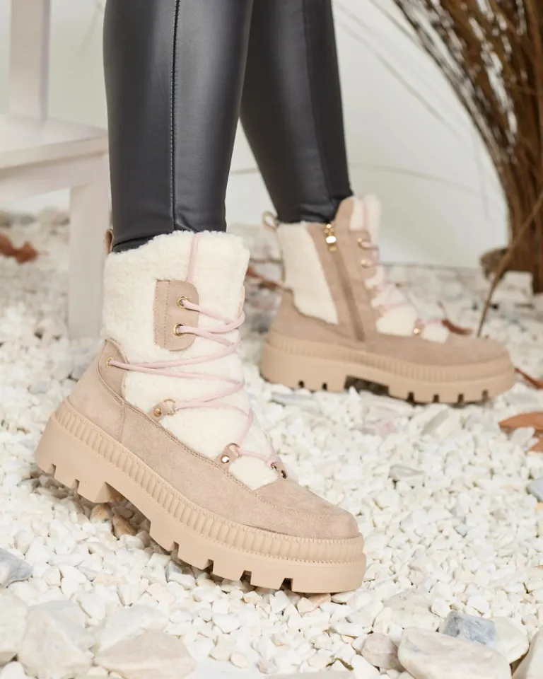 - Rewelacyjne damskie botki wykonane z połączenia skóry ekologicznej matowej i kożuszka. Od środka wypełnienie a’la futerko. Model sznurowany i zapinany na zamek. Świetnie sprawdzą się do zimowych stylizacji!