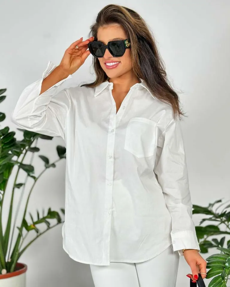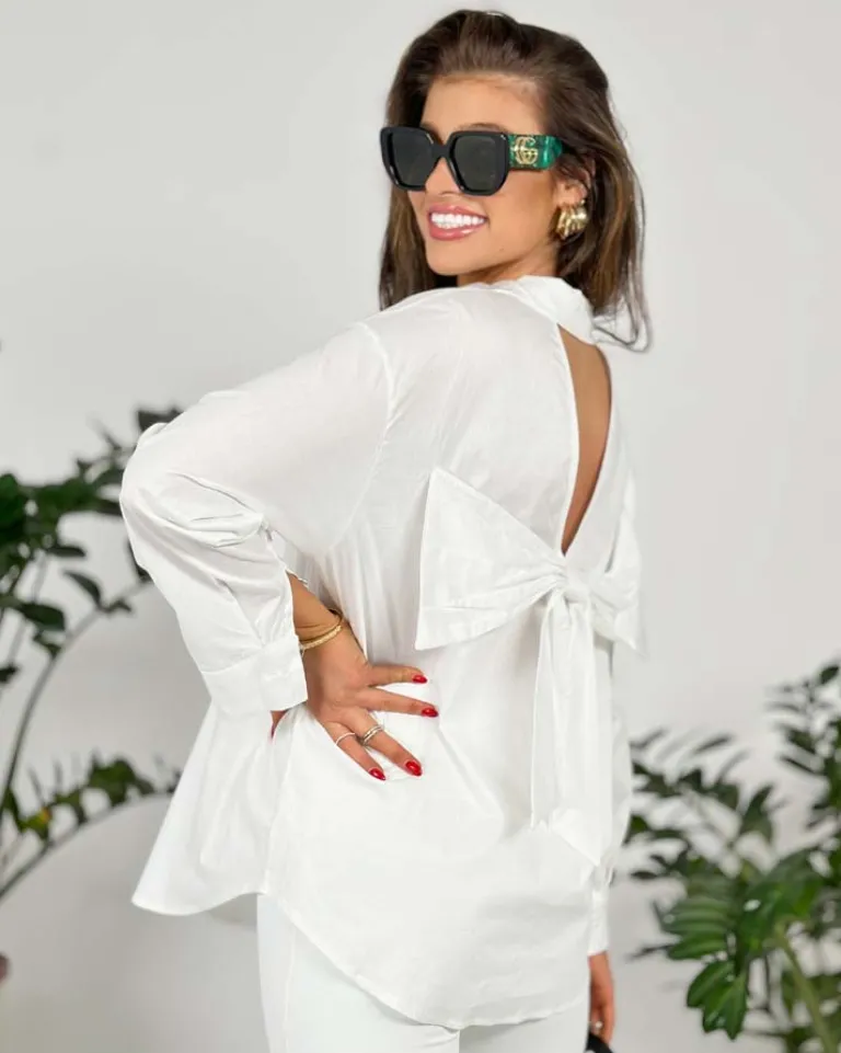 - Rewelacyjna damska koszula zrękawami 3/4. Model z kołnierzykiem, jest zapinany na guziki oraz posiada dużą kokardę na plecach. Must have w szafie każdej kobiety!