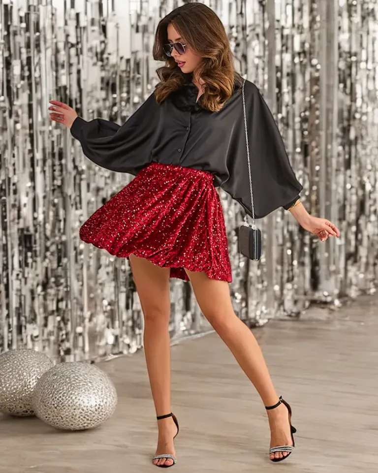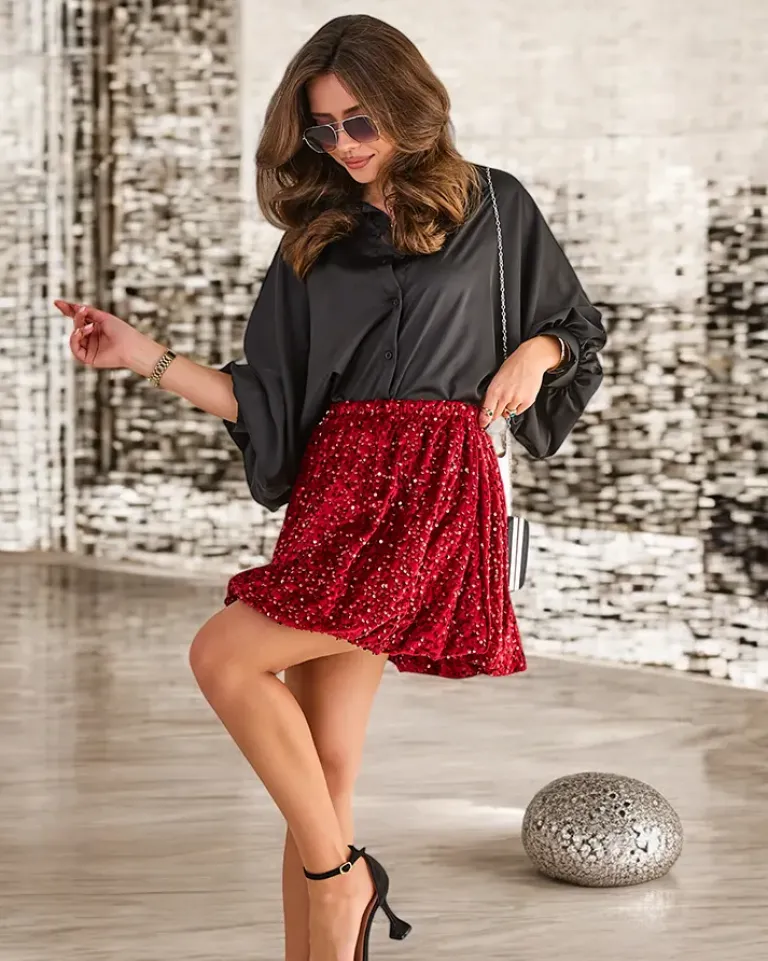 - Błyszcząca spódniczka o długości mini, wykonana z lekkiej tkaniny. Model o rozkloszowanym kroju, posiada gumę w pasie i jest zdobiony cyrkoniami. UWAGA: Dokładność pomiaru (+/-) 1 cm.