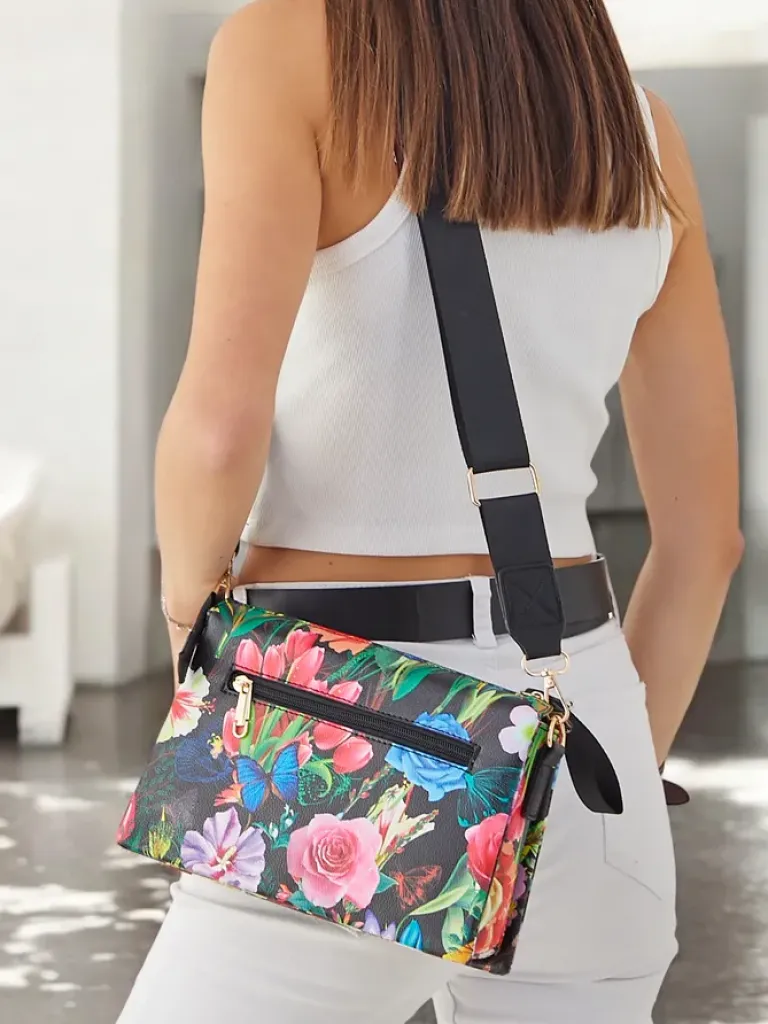 - Kwiatowa mała torebka damska z eko skóry. Model z zapięciem na zamek i magnes, posiada 3 komory. Dodatkowo odpinany, regulowany pasek. Idealna na oficjalne wyjścia!