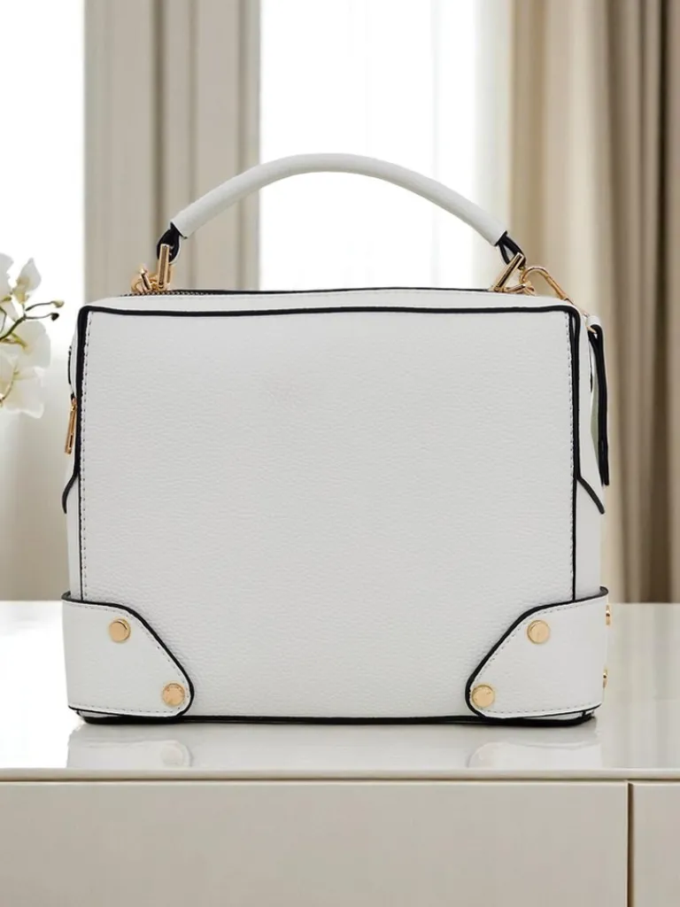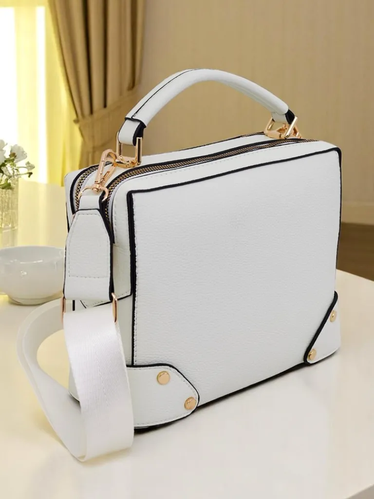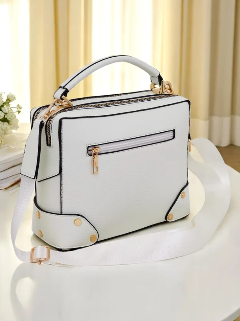 - Kwadratowa torebka z eko skóry, 2 komory, 1 kieszeń zewnętrzna i 3 wewnętrzne. Odpinany, regulowany pasek zapewnia wygodę i dopasowanie do każdej stylizacji.