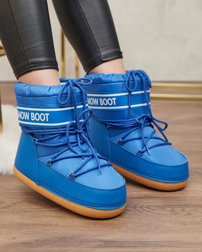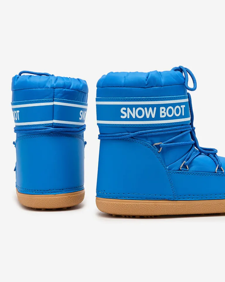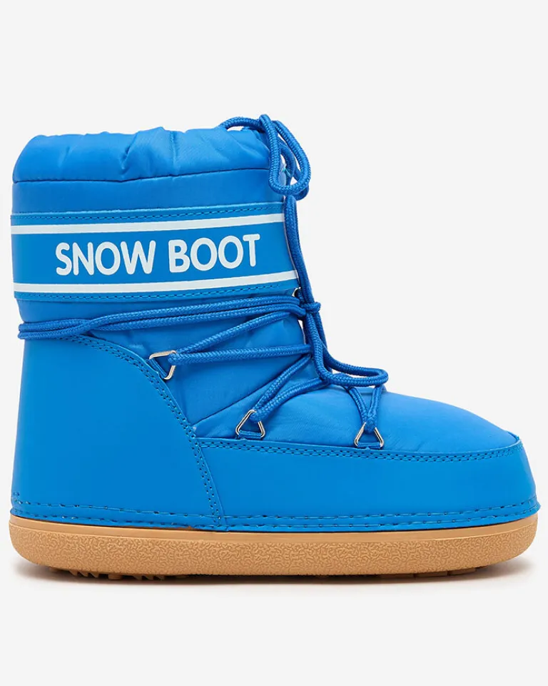 - Damskie obuwie typu śniegowce z cholewką wykonaną z połączenia eko skóry oraz materiału tkaninowego pikowanego. W środku wyłożone tkaniną, obuwie wsuwane i sznurowane, posiada ściągacz.