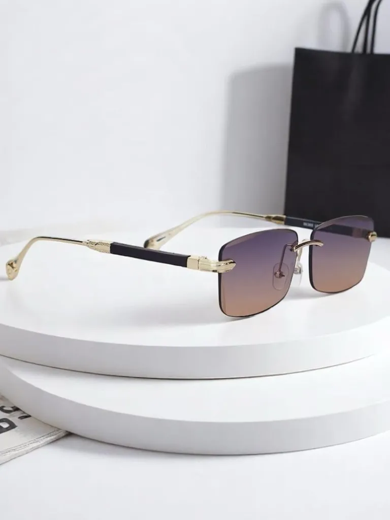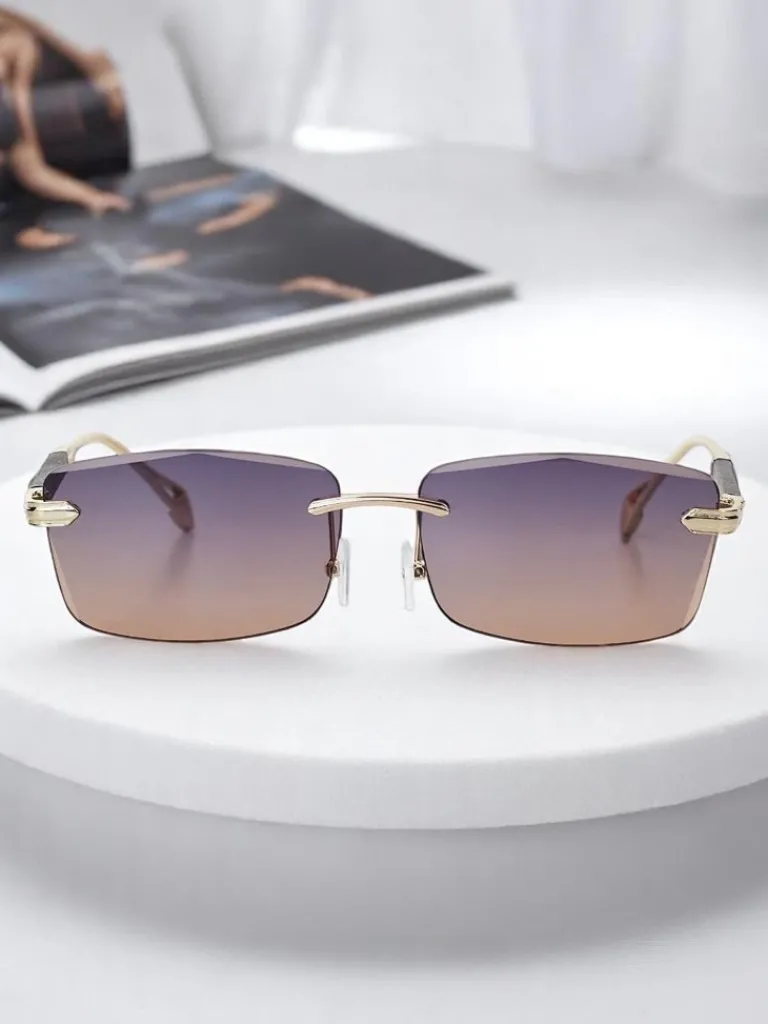 - Małe, wąskie okulary przeciwsłoneczne o prostokątnym kształcie z metalową oprawką. Styl vintage w nowoczesnym wydaniu – idealne dla fanów wyrazistych dodatków retro.