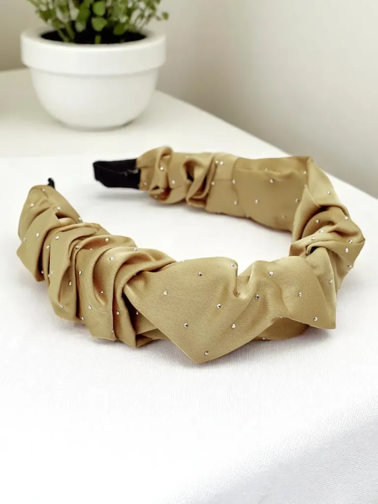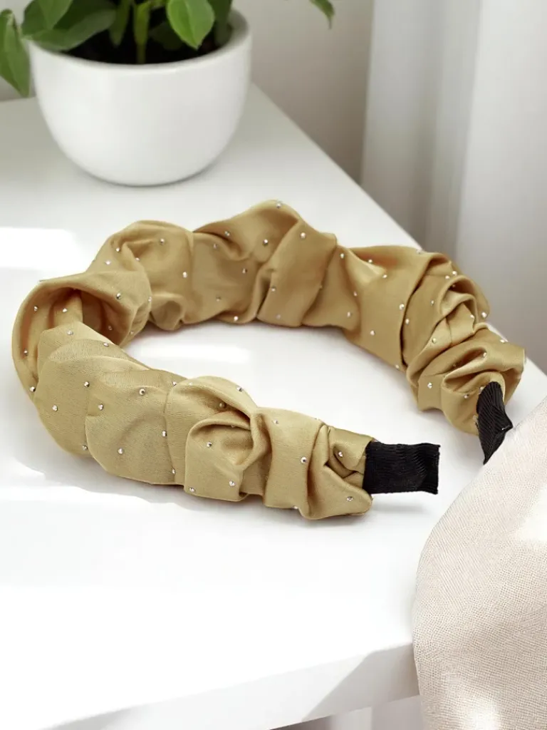 - Satynowa opaska do włosów, marszczona i ozdobiona cyrkoniami, to elegancki dodatek, który doda blasku każdej stylizacji. Miękka tkanina i błyszczące detale tworzą efekt glamour. Idealna na specjalne okazje i wieczorne wyjścia.