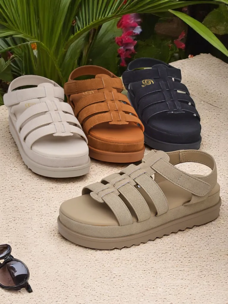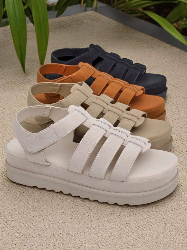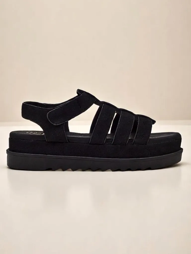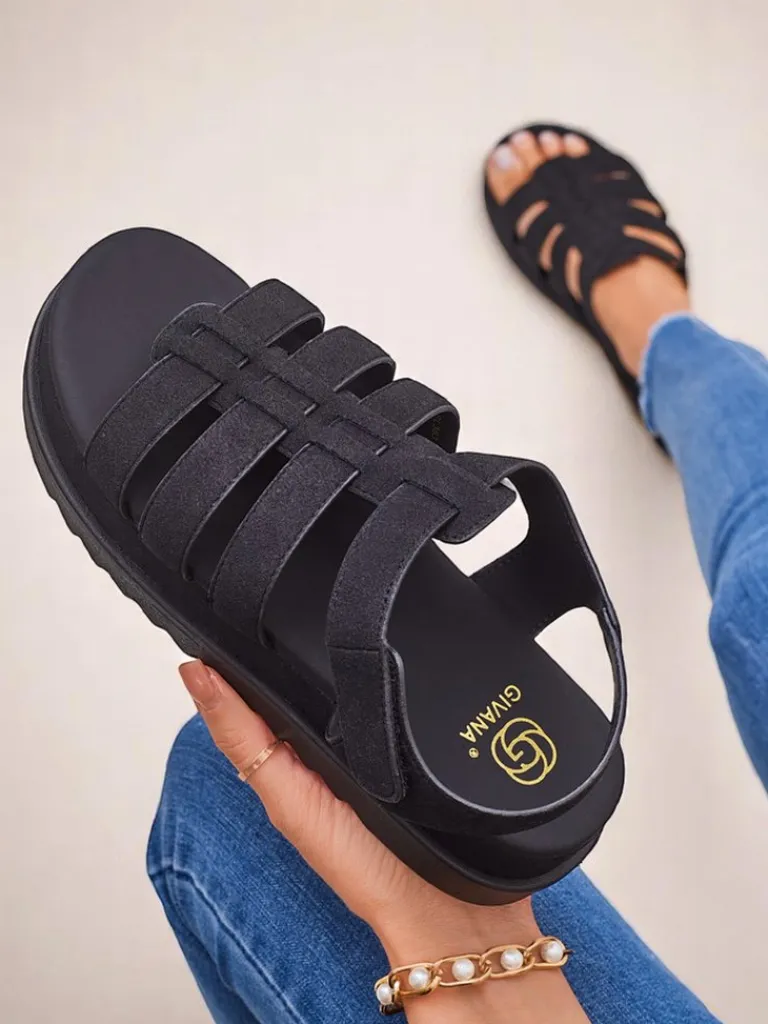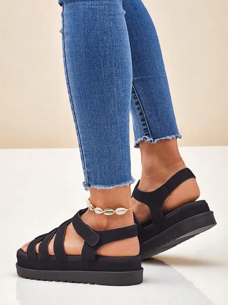 - Damskie sandały w stylu rzymianek wykonane z miękkiego eko zamszu. Wkładka z eko skóry zapewnia komfort, a zapięcie na rzep ułatwia dopasowanie. Idealne do letnich stylizacji.