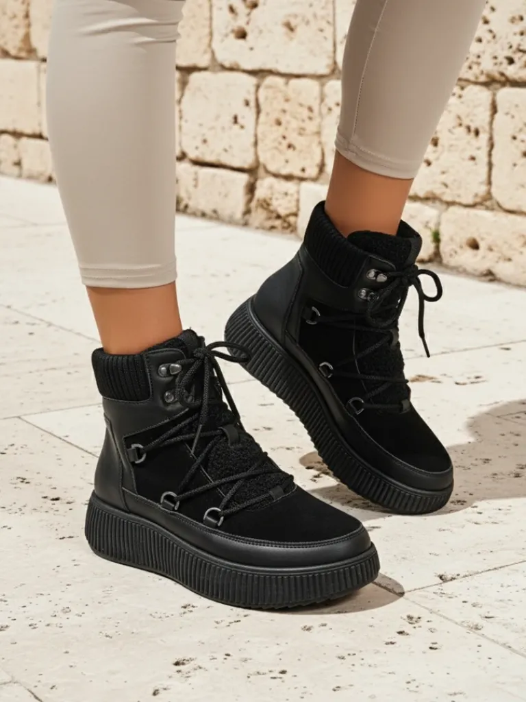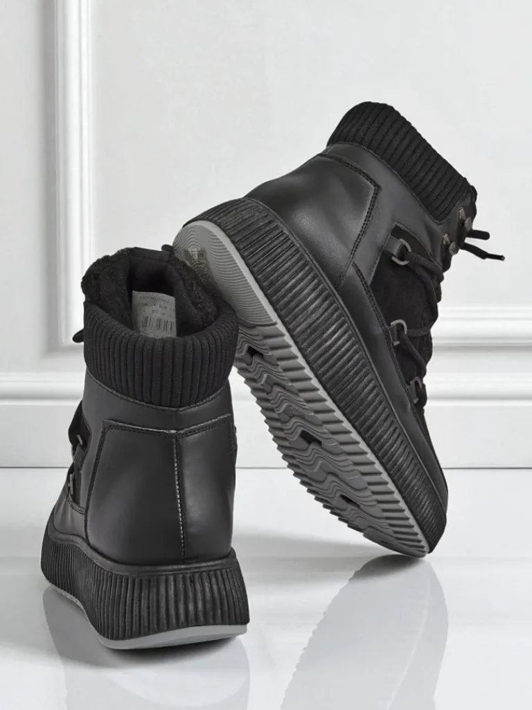 - Ponadczasowe damskie obuwie typu śniegowce na grubej podeszwie. Cholewka wykonana ze skóry ekologicznej i eko zamszu. W środku ocieplenie w formie futerka, obuwie sznurowane. Idealne na chłodniejszą porę roku!