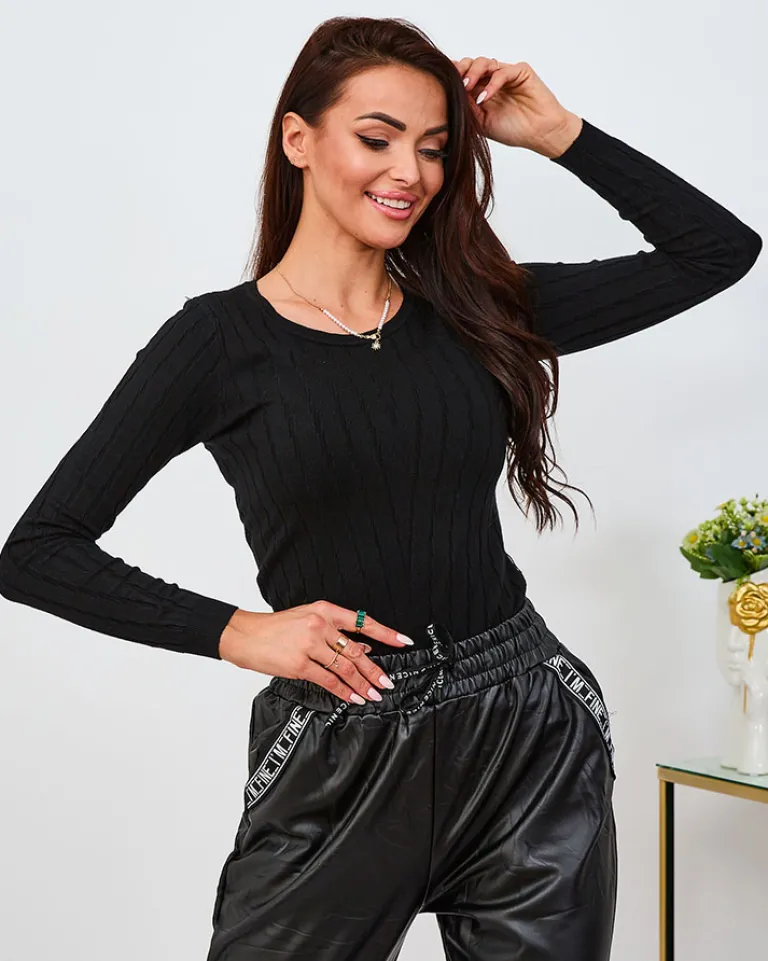 - Wyjątkowy damski sweter wykonany z przyjemnej, miękkiej tkaniny. Produkt posiada długie rękawy, okrągły dekolt oraz jest zdobiony prążkami. Idealny do tworzenia casualowych outfitów! UWAGA: Dokładność pomiaru (+/-) 1 cm.