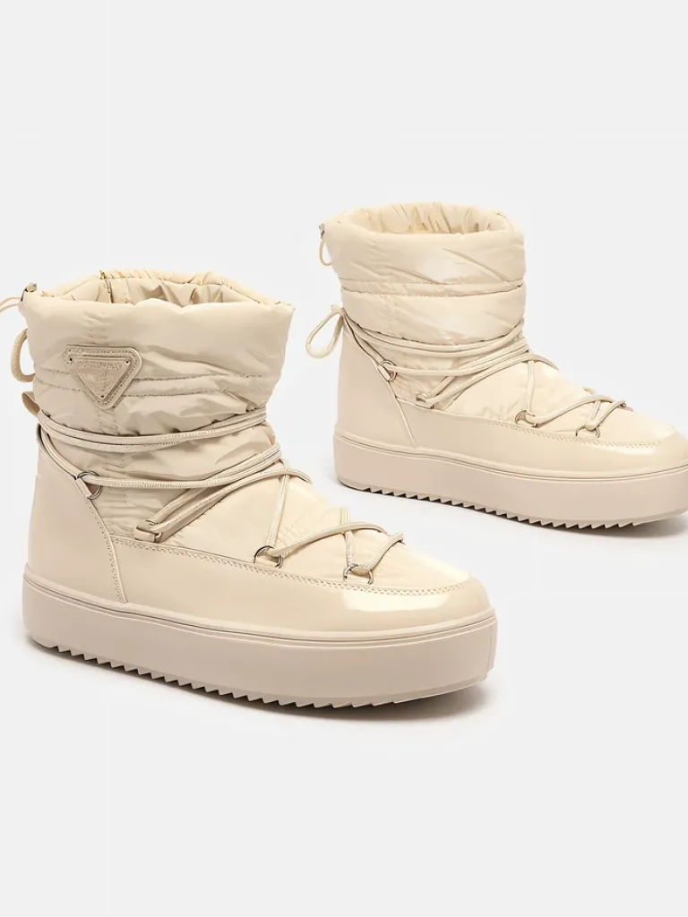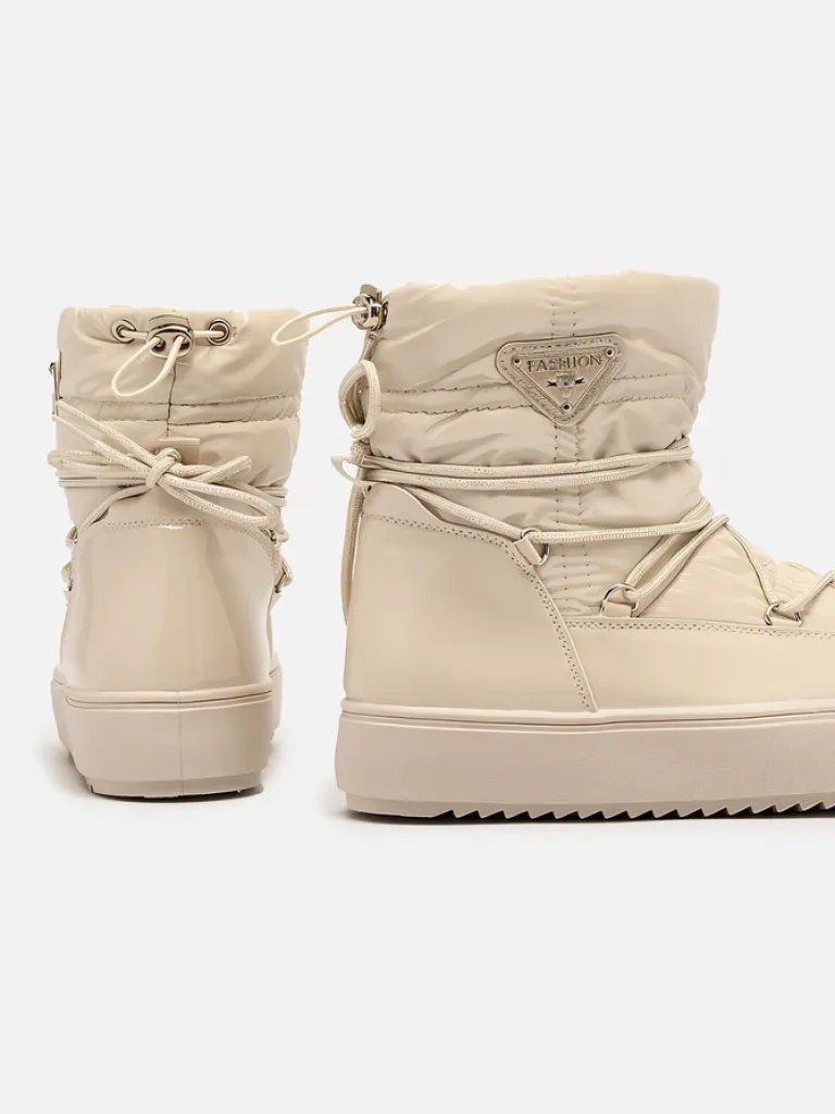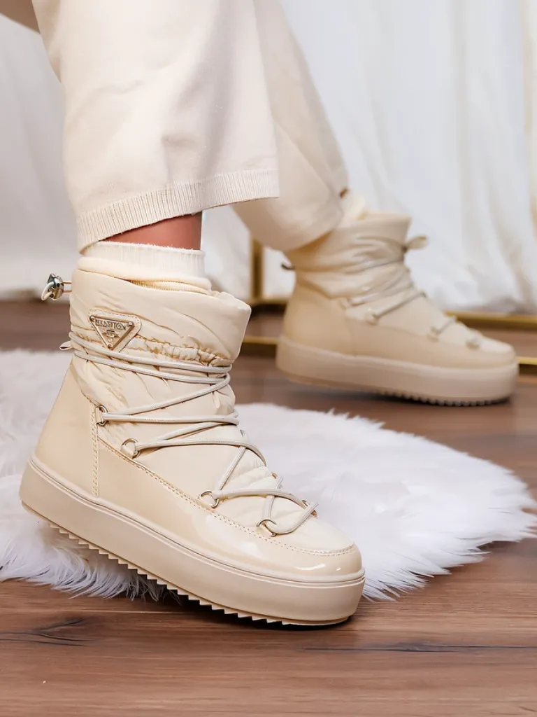 - Damskie obuwie typu śniegowce z cholewką wykonaną z połączenia eko skóry lakierowanej oraz materiału a’la cerata. W środku ocieplenie w formie futerka, obuwie wsuwane. Model posiada ściągacz na końcu cholewki. Idealne na zimę!