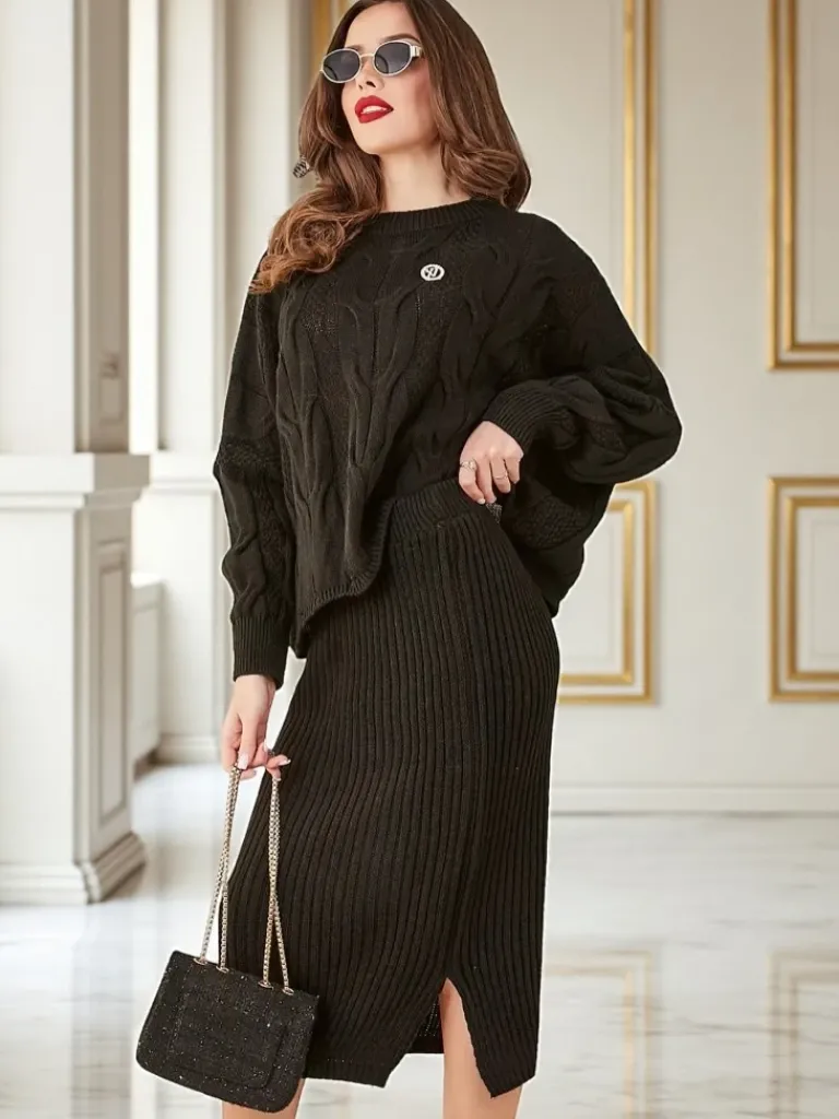 Outlet Akrylowy pleciony komplet damski ze swetrem i spódnicą Warm&Fuzzy Damskie Komplety Damskie