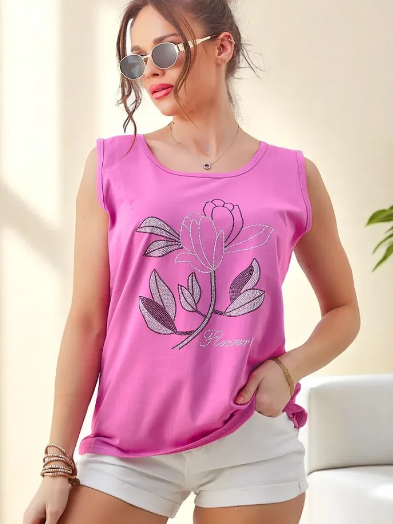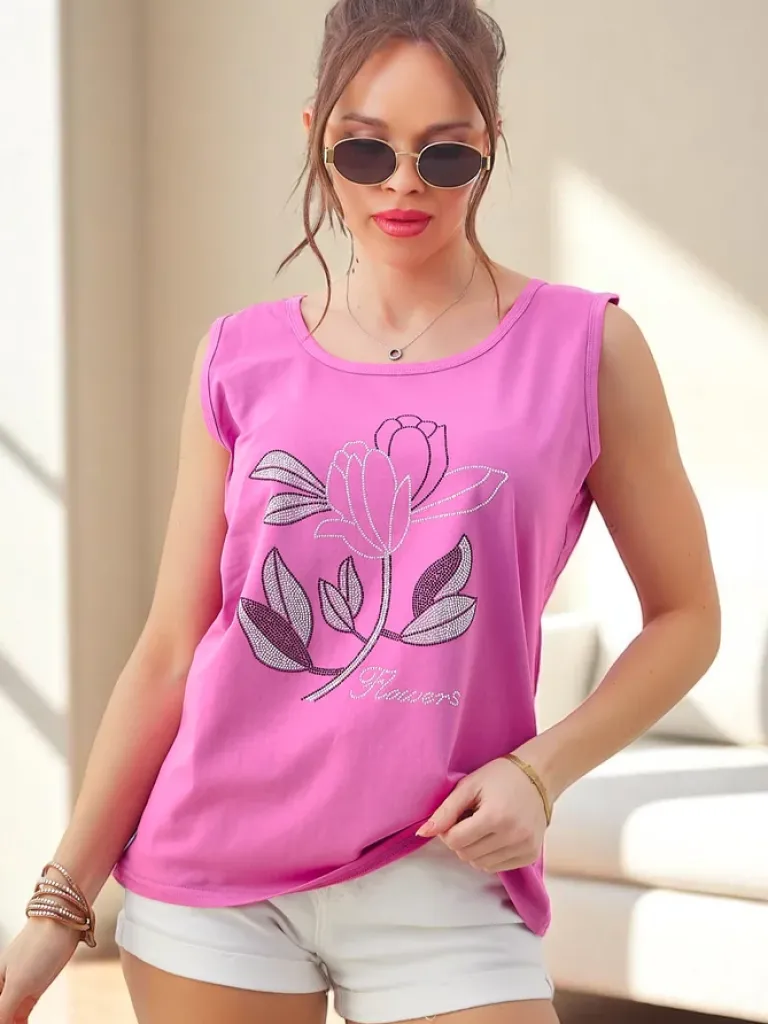 - Casualowa bluzka damska na ramiączkach, która podkreśla kobiecą delikatność. Miękki materiał otula sylwetkę, a okrągły dekolt i kwiat z cyrkonii dodają wyrafinowanego akcentu. Idealna na co dzień jak i specjalne okazje!