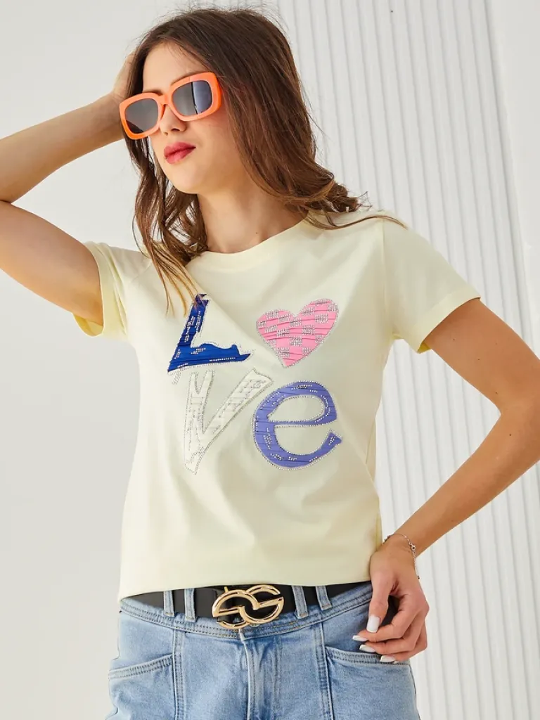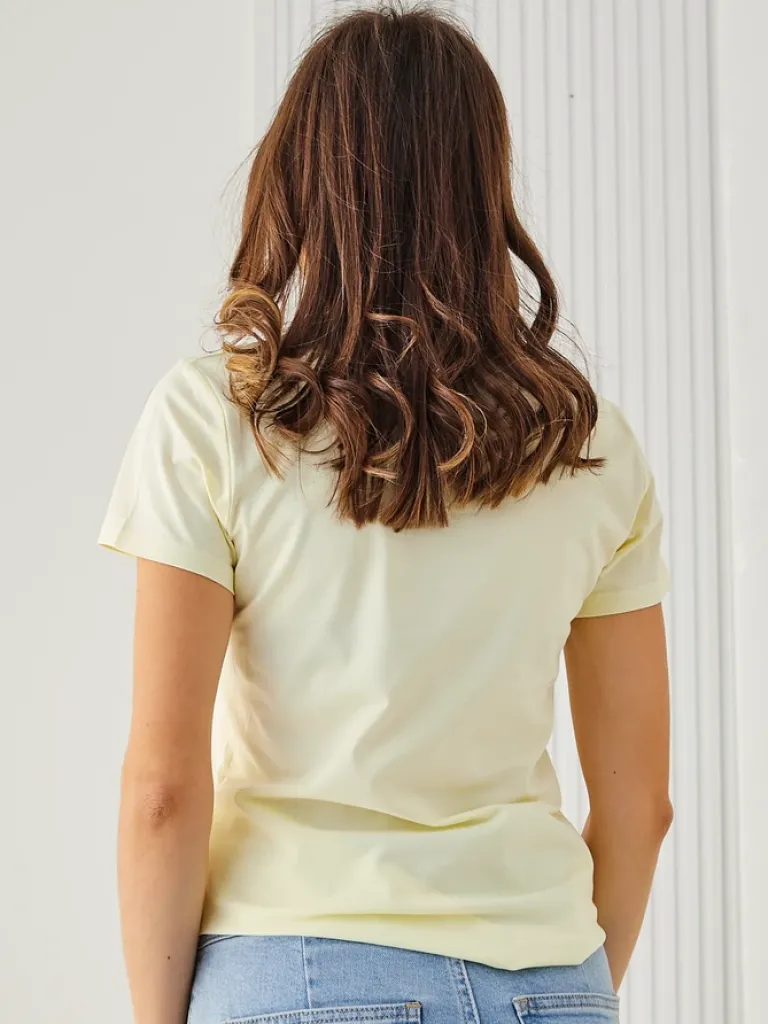 - Oryginalna damska bluzka z okrągłym dekoltem, uszyta z miękkiej tkaniny, zapewniającej komfort przez cały dzień. Subtelny napis i krótki rękaw dodają lekkości, czyniąc ją doskonałym wyborem do modnych i stylowych zestawów na co dzień.