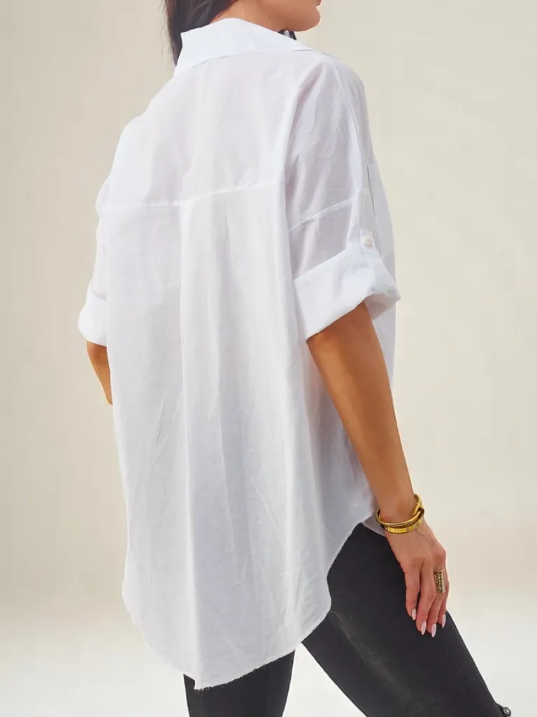 - Bawełniana koszula damska z rękawami 3/4 – lekka, wygodna i idealna na co dzień. Elegancka prostota w klasycznym wydaniu.