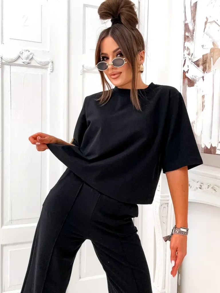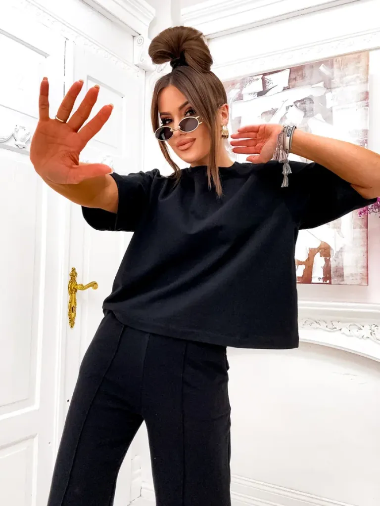 - Damski komplet casualowy wykonany z przyjemnej tkaniny. Bluza zakładana przez głowę, posiada krótkie rękawy oraz okrągły dekolt. Szerokie spodnie z gumą w pasie. Idealny dla tych, którzy cenią komfort.
