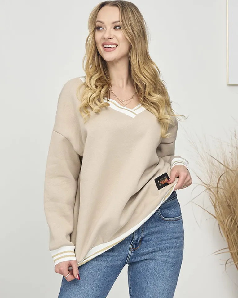 - Damska bluza ocieplana polarem, posiada dekolt w serek i jest zdobiona wstawkami z brokatem. UWAGA: Dokładność pomiaru (+/-) 1 cm.