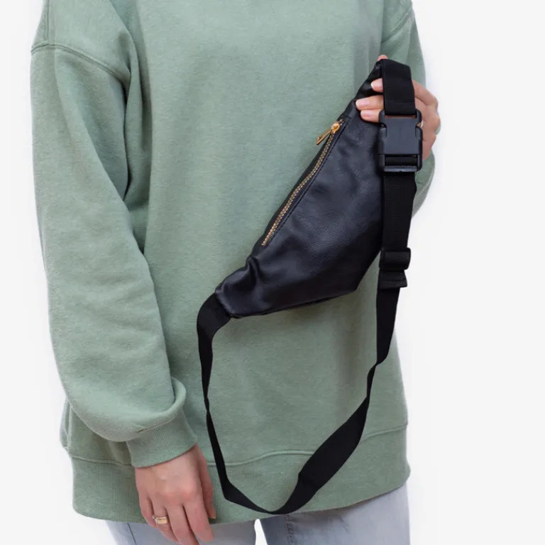 - Modna damska torebka typu nerka, wykonana z miękkiej eko-skóry z brokatowym wykończeniem. Model posiada 2 zasuwane kieszonki i szeroki pas z możliwością regulacji, zapinany na klamrę zatrzaskową. Idealna baza dla wielu codziennych looków!