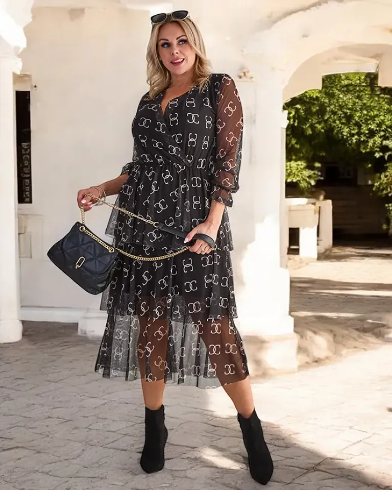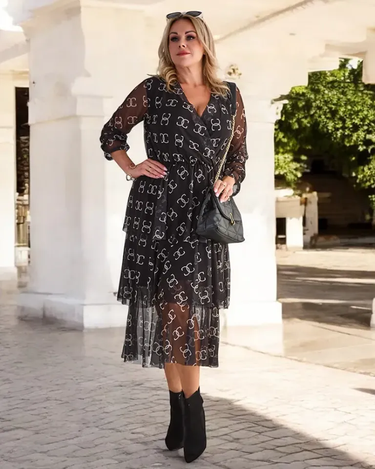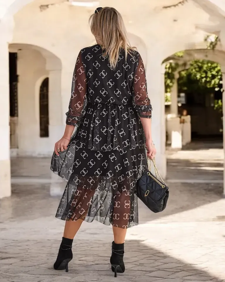 - Sukienka damska midi z printem wykonana z prześwitującego materiału a’la siateczka z podszewką. Model z długimi rękawami i dekoltem w serek z gumką w talii. Idealna na co dzień!
