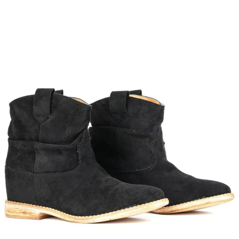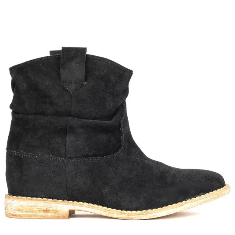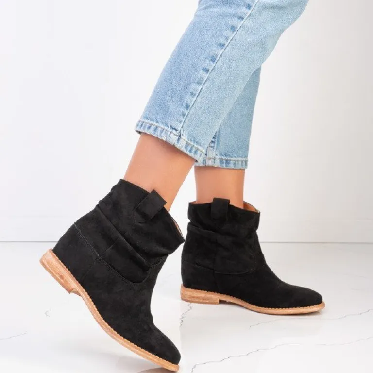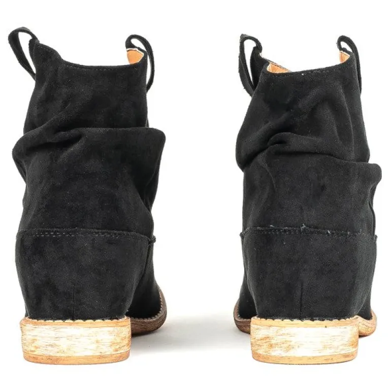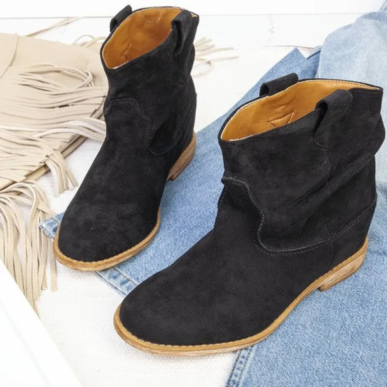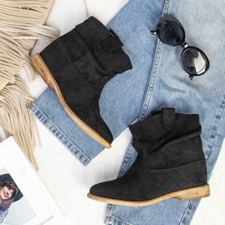 - Czarne botki a’la kowbojki wykonane ze skóry ekologicznej zamszowej. Model posiada ocieplenie w środku w formie miękkiego futerka. Obuwie na niskiej krytej koturnie. Buty bez zapięcia. Idealne na chłodniejsze dni.