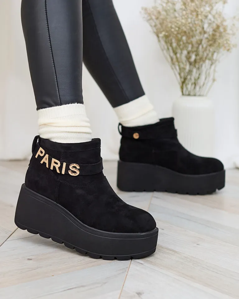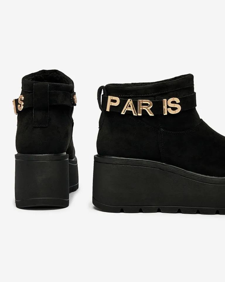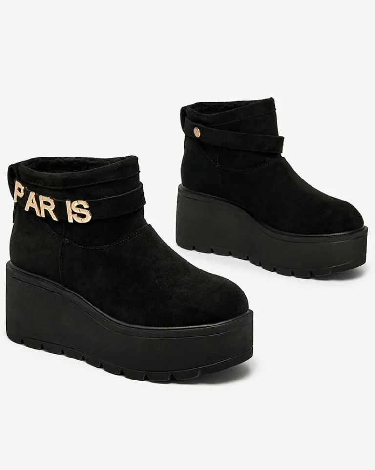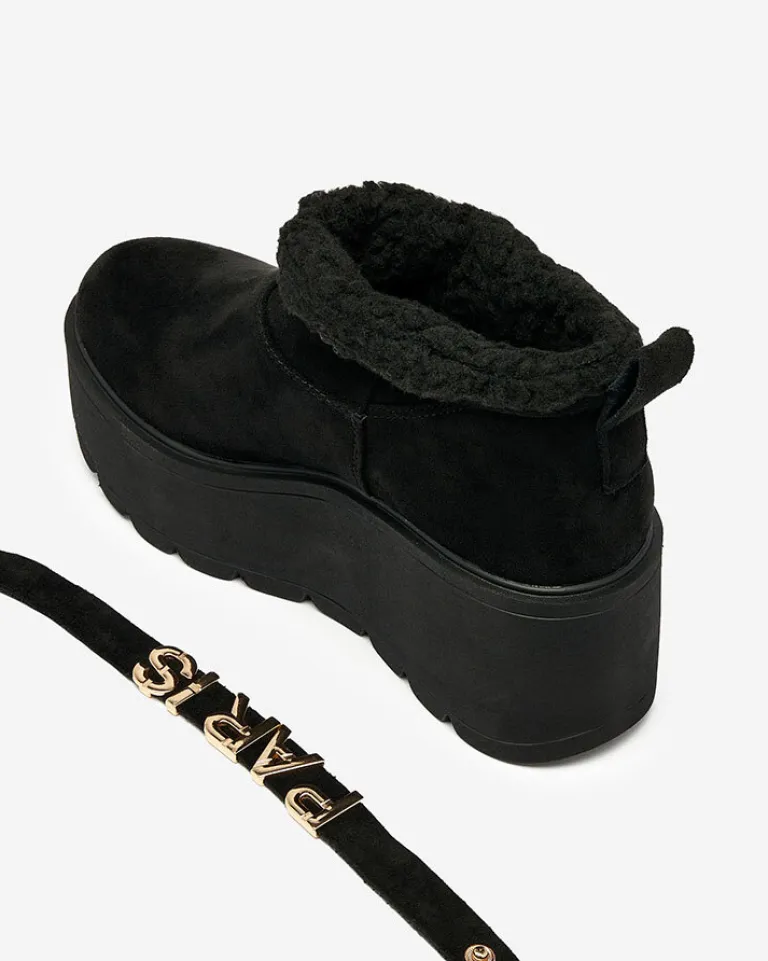- Mega stylowe damskie ocieplane śniegowce wykonane ze skóry ekologicznej zamszowej. Posiadają środek wypełniony futerkiem a’la kożuszek. Dodatkowo odpinany paseczek zdobiony napisem. Buty na wysokiej platformie – idealne do zimowych casualowych outfitów!