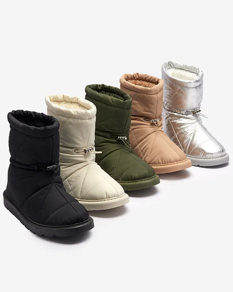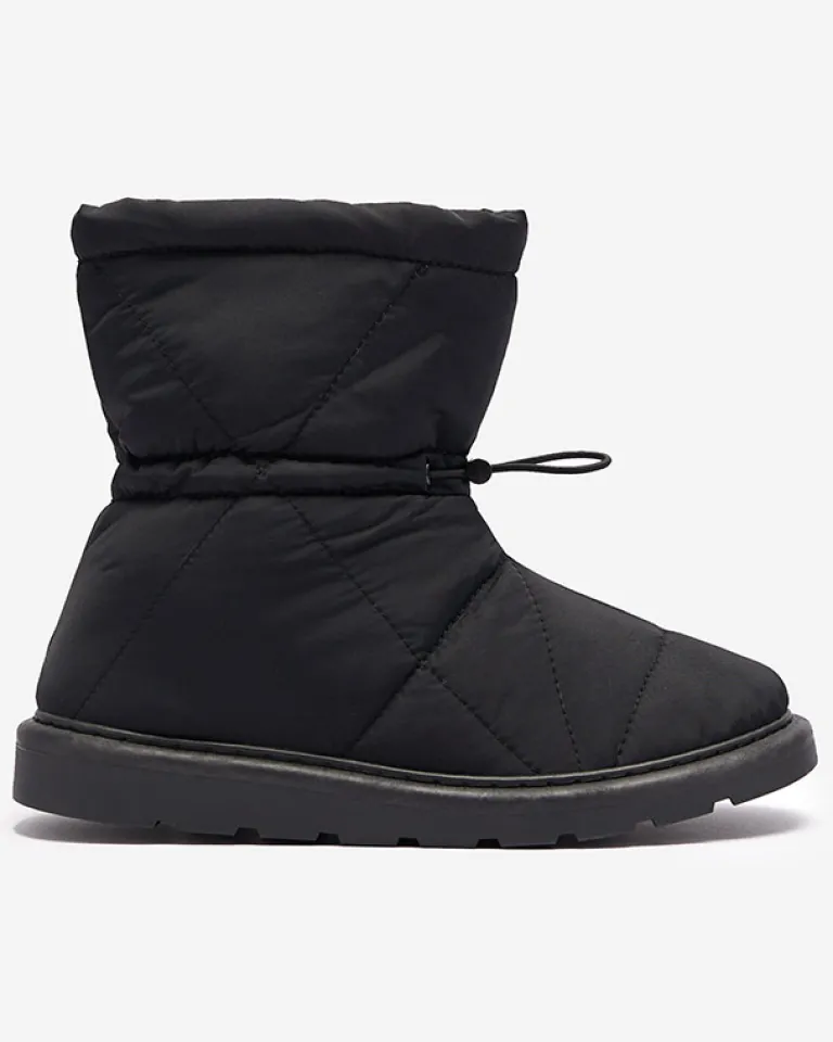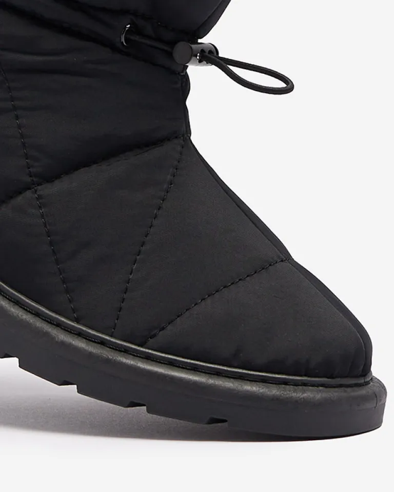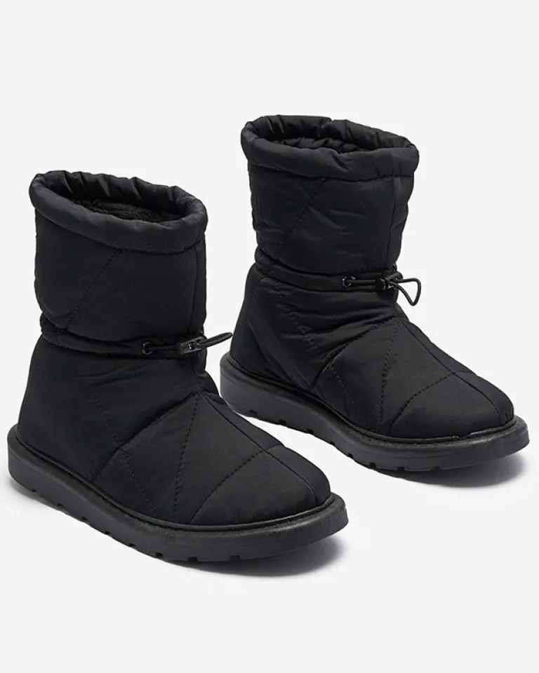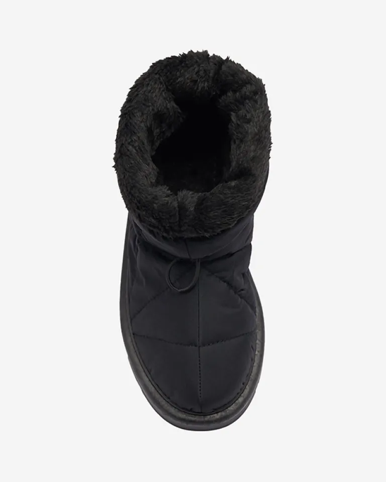 - Mega stylowe damskie buty zimowe a’la śniegowce, cholewka jest wykonana z materiału sztucznego a’la cerata. Środek jest ocieplony grubym futerkiem, obuwie jest wsuwane i posiada ściągacz na wysokości kostki. CZARNE OCIEPLANE BUTY ŚNIEGOWCE KALIOLEN
