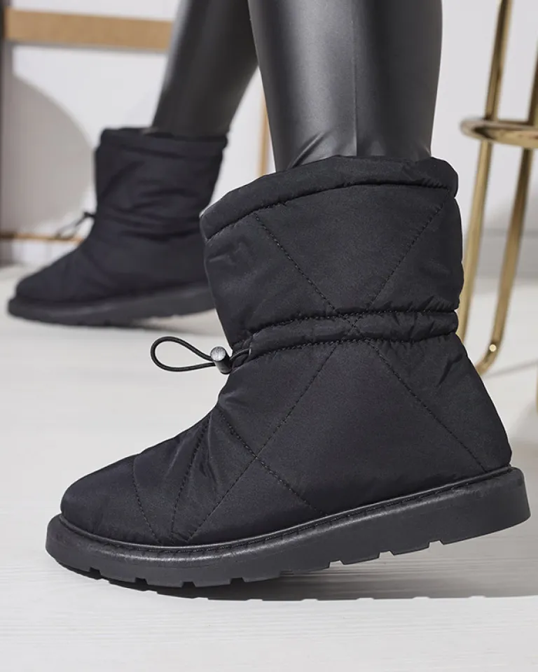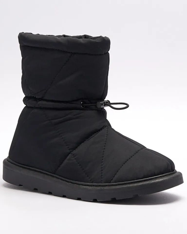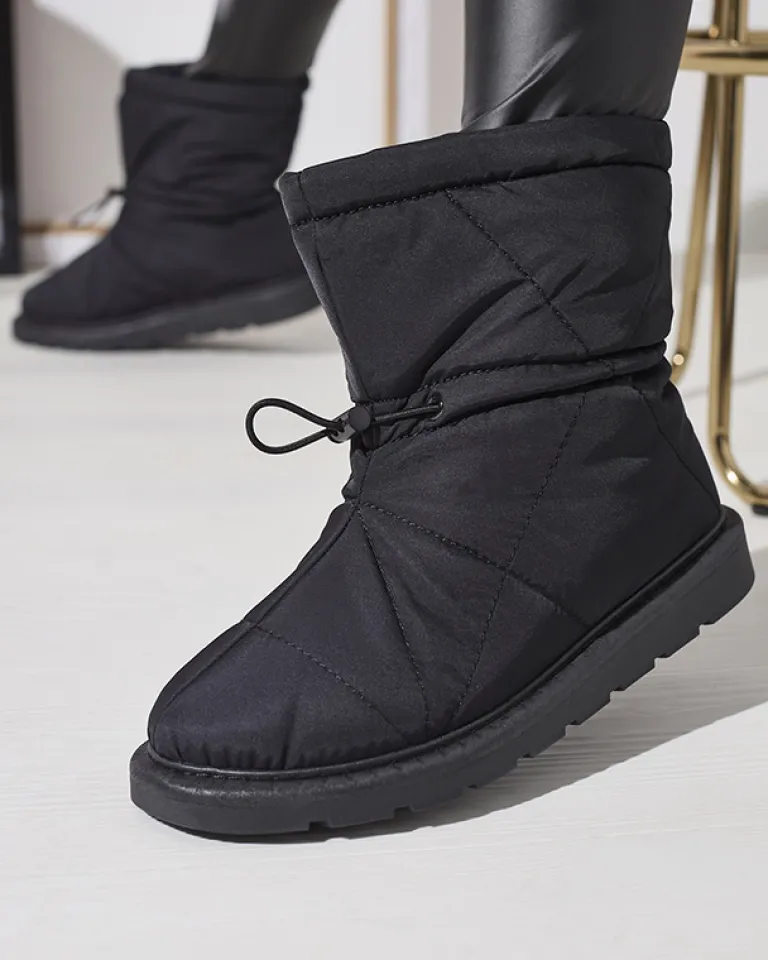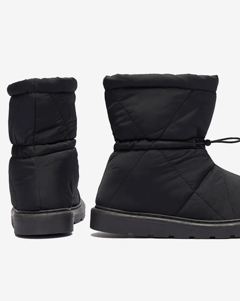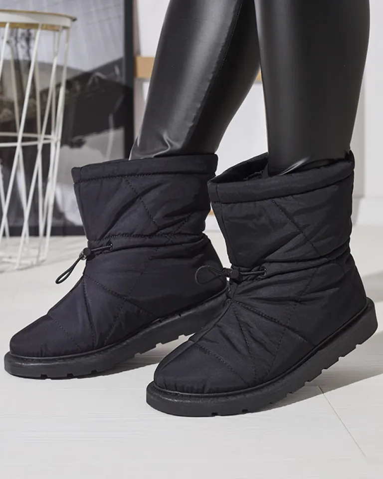 - Mega stylowe damskie buty zimowe a’la śniegowce, cholewka jest wykonana z materiału sztucznego a’la cerata. Środek jest ocieplony grubym futerkiem, obuwie jest wsuwane i posiada ściągacz na wysokości kostki. CZARNE OCIEPLANE BUTY ŚNIEGOWCE KALIOLEN