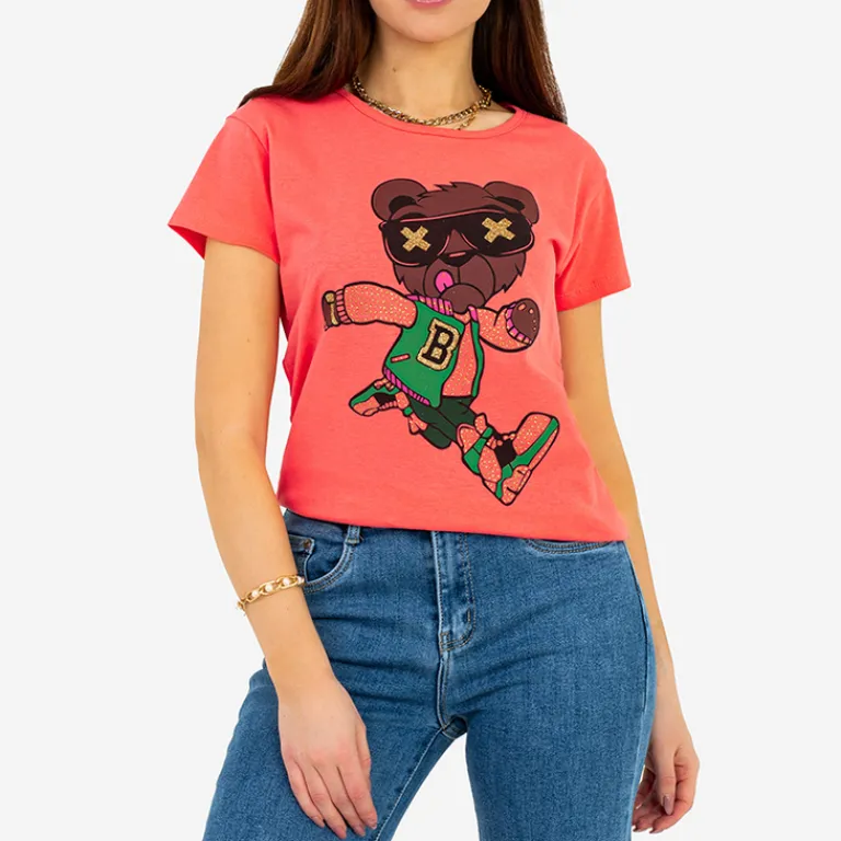 - T-shirt damski z bawełny, z krótkimi rękawami i okrągłym dekoltem. Na przodzie koszulka jest udekorowana printem. Idealna na lato! UWAGA: Dokładność pomiaru (+/-) 1 cm.