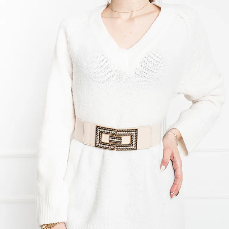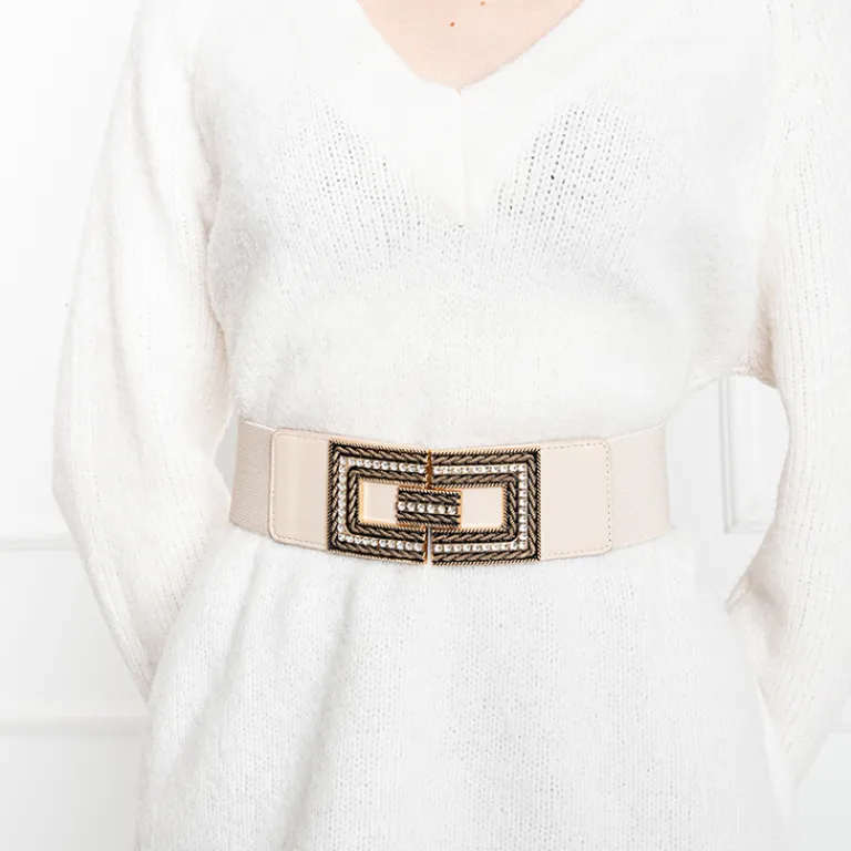 - Świetny pasek damski ze złotą klamrą, wykonany z połączenia skóry ekologicznej oraz gumy. Ten efektowny model idealnie pasuje do sukienek i spodni.