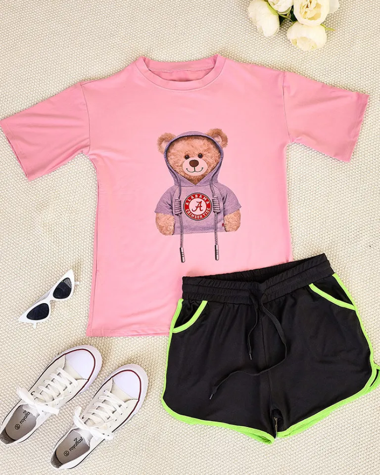 - Damski komplet wykonany z przyjemnego materiału. Model posiada nadruk z misiem. Bluzka z krótkimi rękawami oraz krótkie spodenki z gumą w pasie. Poczuj lato w tym wspaniałym komplecie!