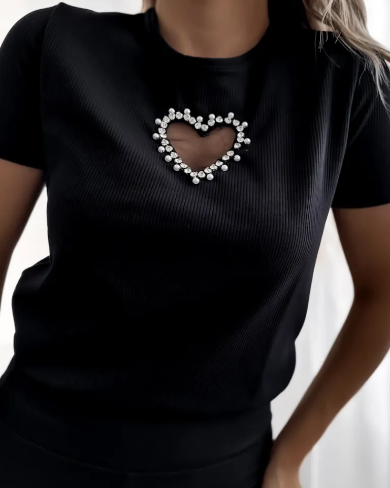 - Wyjątkowy damski komplet sportowy, wykonany z elastycznego materiału prążkowanego. Na t-shircie oraz na legginsach modne serduszka z siateczką i kryształkami. Legginsy posiadają szeroką elastyczną gumę w pasie. UWAGA: Dokładność pomiaru (+/-) 1 cm.