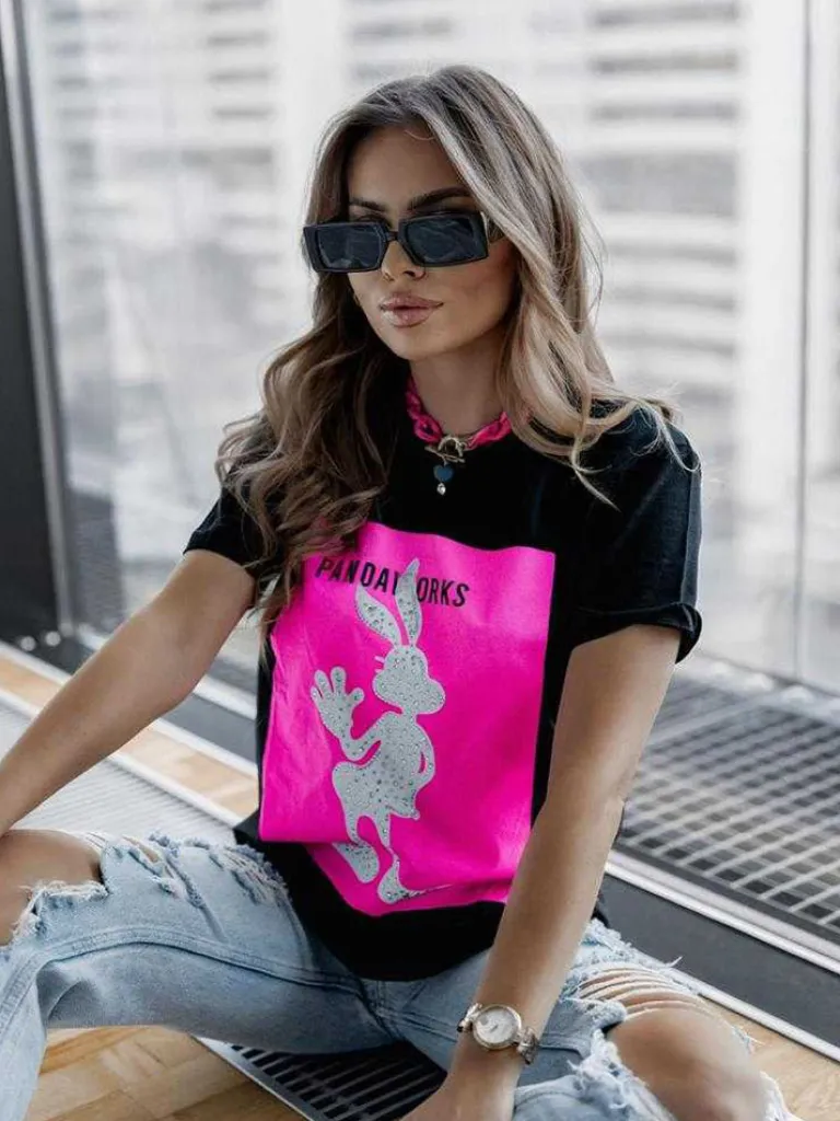 - Casualowy damski t-shirt z nadrukiem na krótkich rękawach. Wykonany z tkaniny bawełnianej. Idealna baza dla wielu codziennych looków! UWAGA: Dokładność pomiaru (+/-) 1 cm. Wymiary mierzone na płasko.