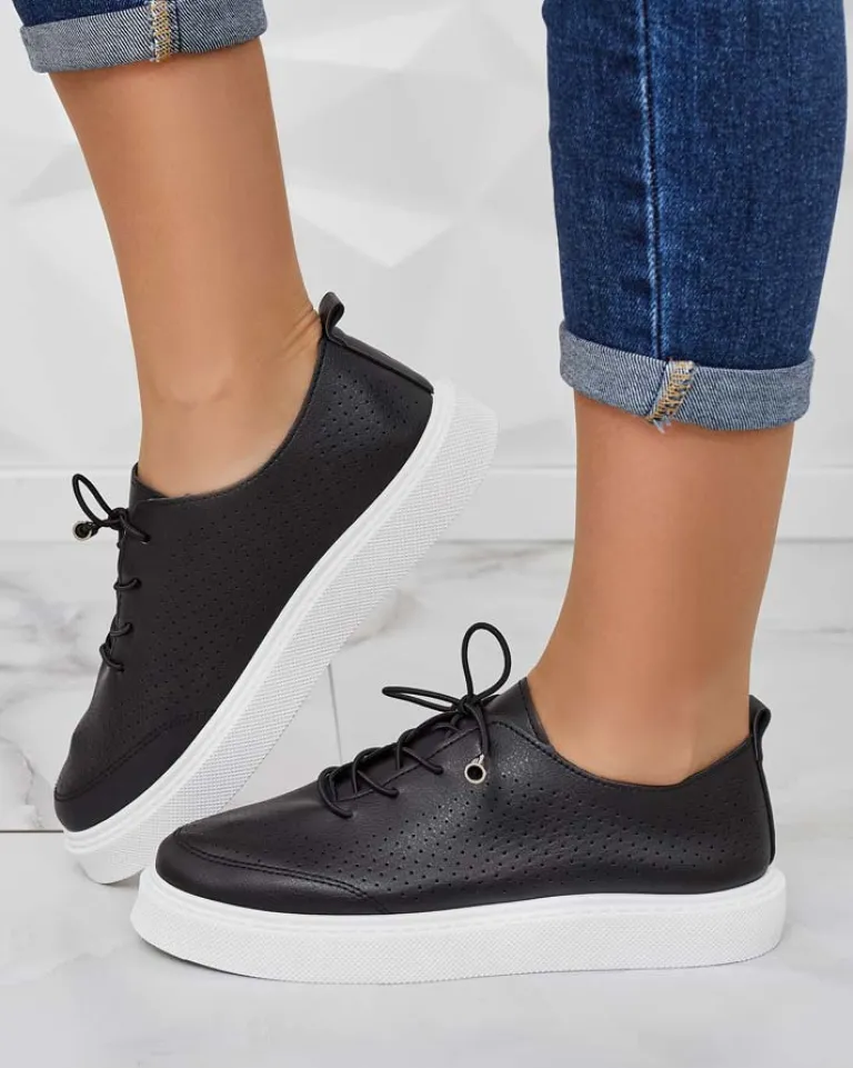 - Lekkie damskie buty sportowe w stylu tenisówek na płaskiej podeszwie. Sznurowana cholewka wykonana ze skóry ekologicznej z ażurowym wykończeniem. W środku wkładka z materiału tkaninowego. Świetnie sprawdzą się podczas letnich spacerów!