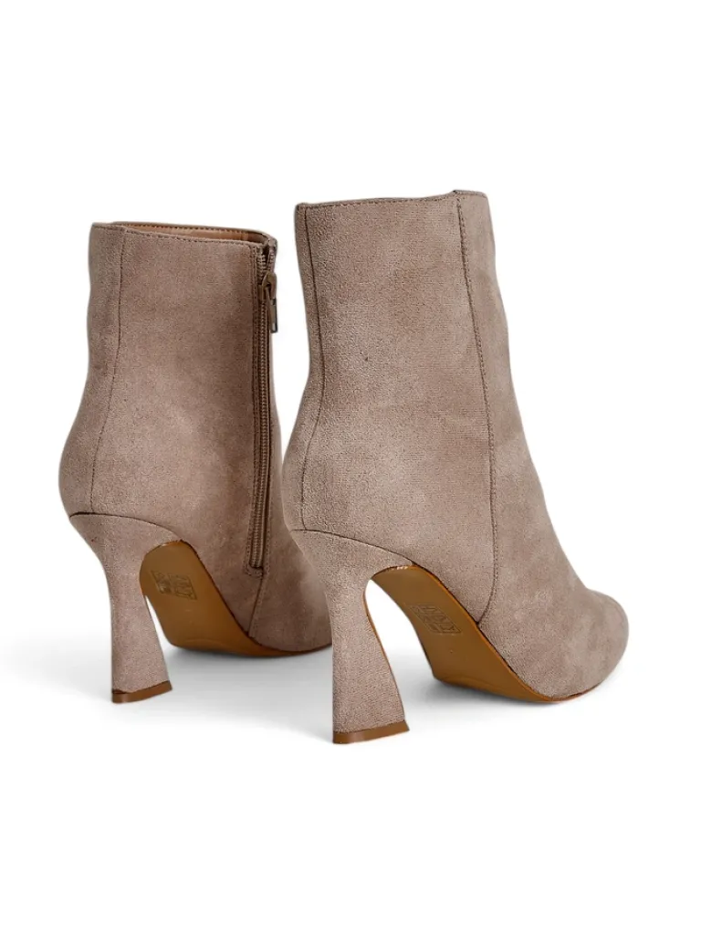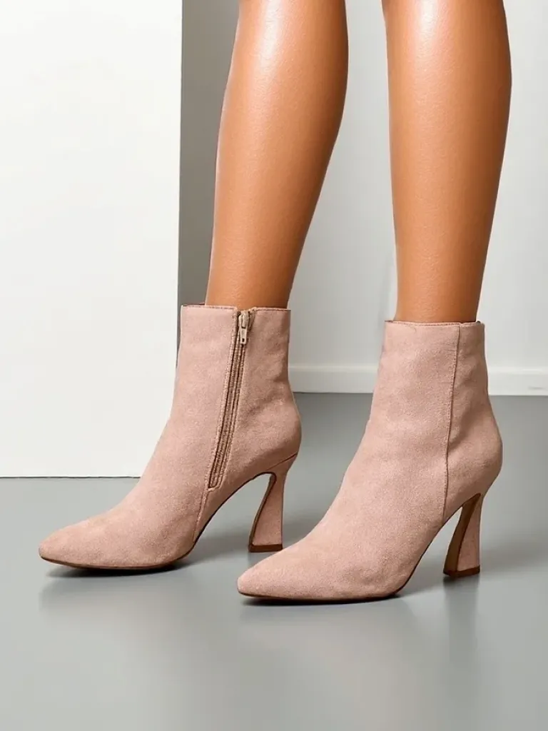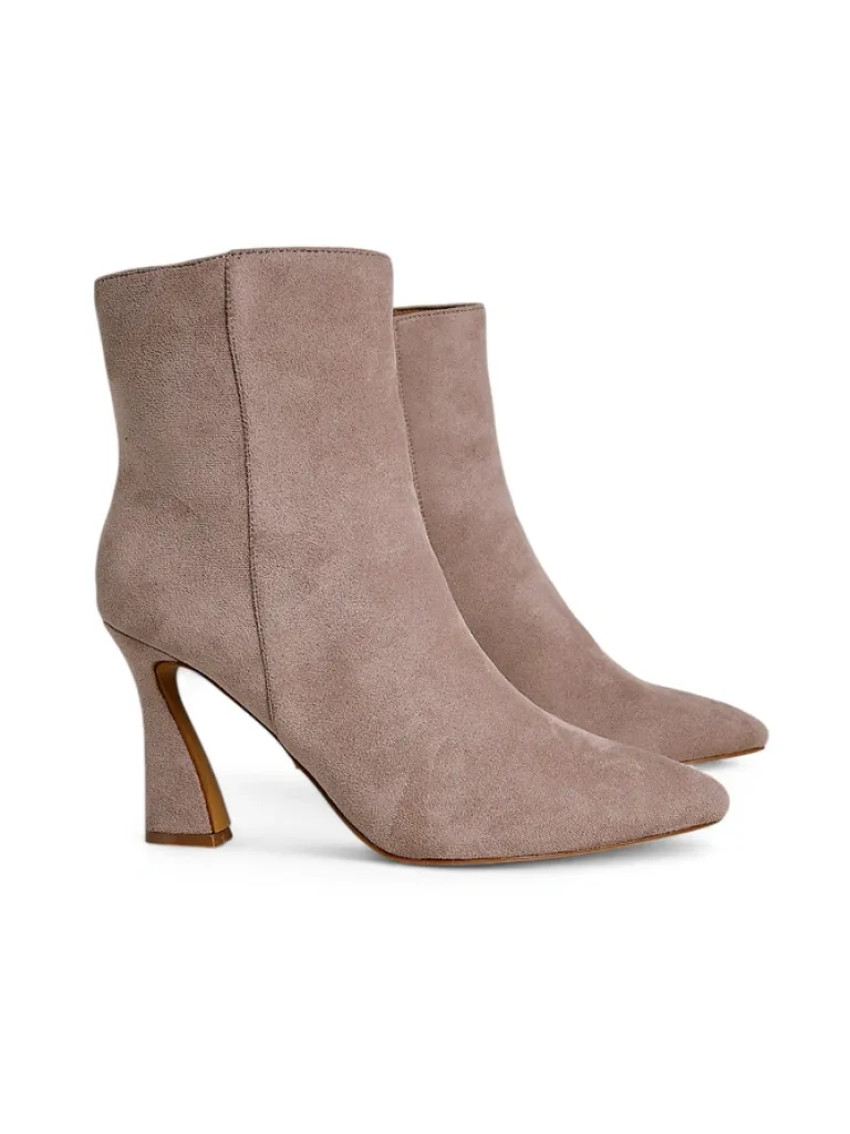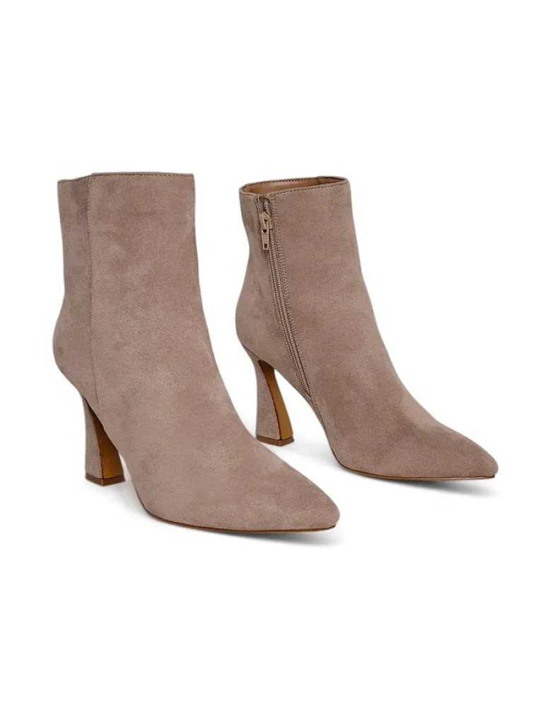 - Stylowe damskie eko-zamszowe botki – to idealne rozwiązanie na chłodniejsze dni. Model zapinany na suwak, posiada eko skórzaną wkładkę. Model na szpilce i ze spiczastym noskiem.