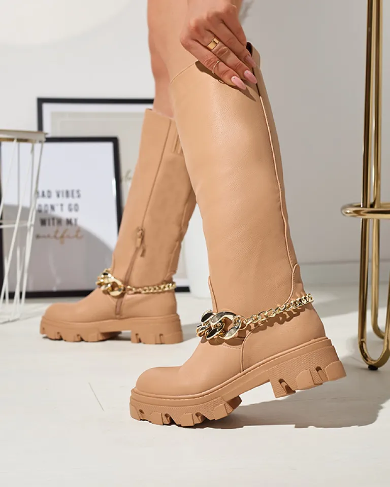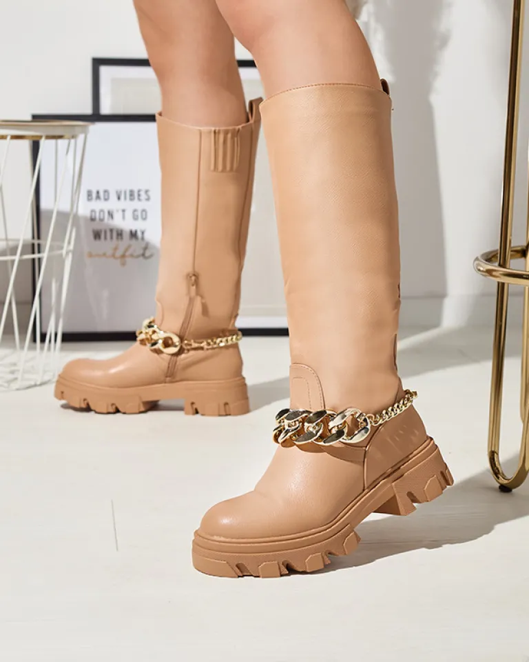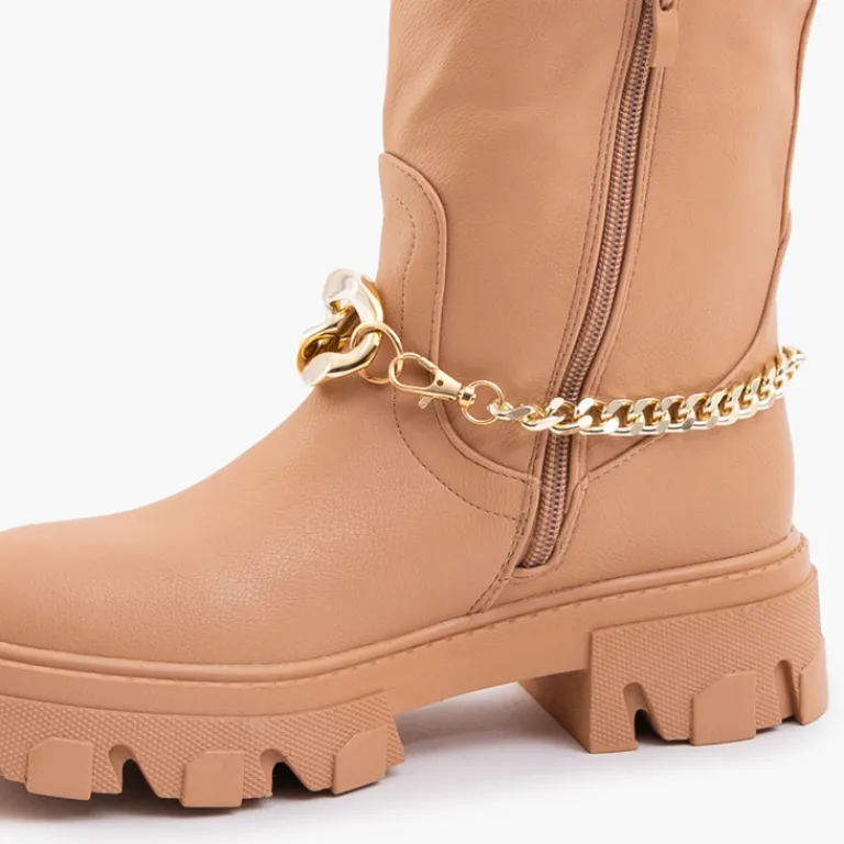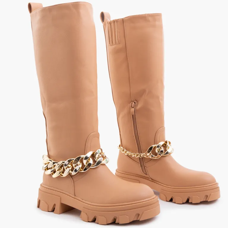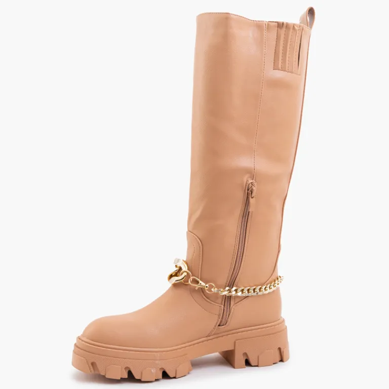 - Klasyczne damskie kozaki do kolana, wykonane ze skóry ekologicznej. Na wysokości kostki model zdobiony odpinanym paseczkiem z plastikowym łańcuszkiem w złotym kolorze. Buty są zapinane na suwak, w środku ocieplenie w formie delikatnego futerka.