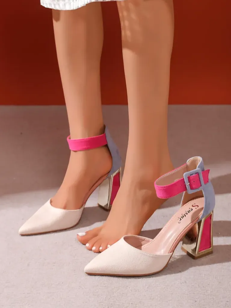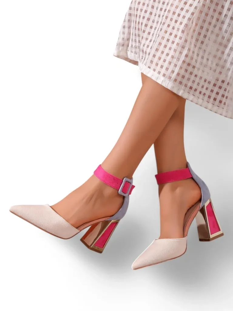 - Eleganckie damskie czółenka na ozdobnym słupku, wykonane z połączenia skóry ekologicznej i eko zamszu. Środek buta jest wyłożony skórą ekologiczną, a nosek spiczasty. Klasa i szyk mody!