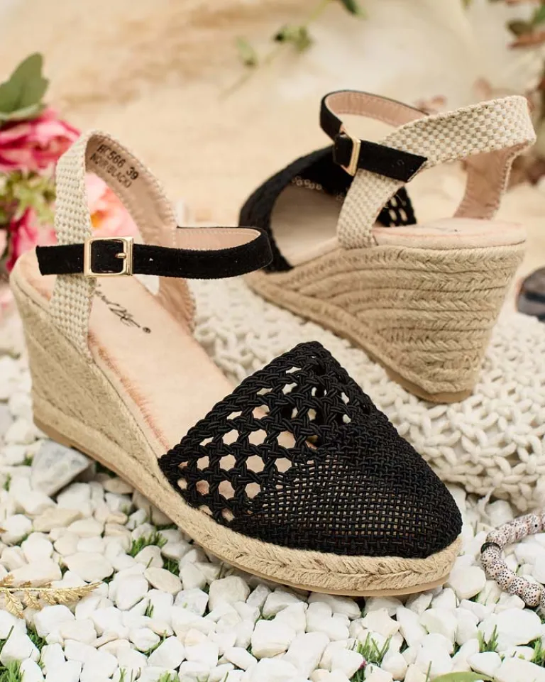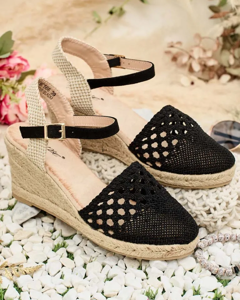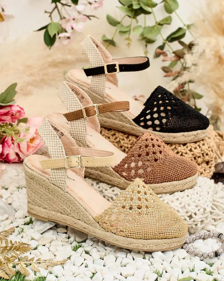 - Damskie sandały a’la espadryle na koturnie wykonane są z tkaniny, wkładka to skóra ekologiczna. Obuwie posiada zapięcie na sprzączkę. Must have tego sezonu!
