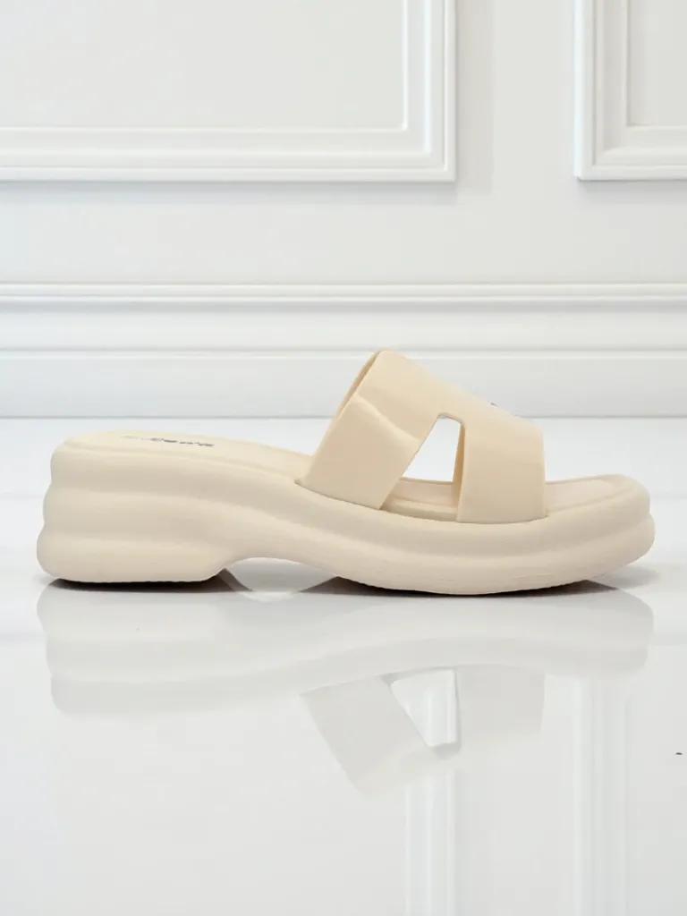 - Damskie klapki na grubszej podeszwie, z wkładką z ekologicznej skóry i paskiem z lakierowanej gumy. Nowoczesny styl i komfort w jednym – idealne do letnich, miejskich stylizacji.