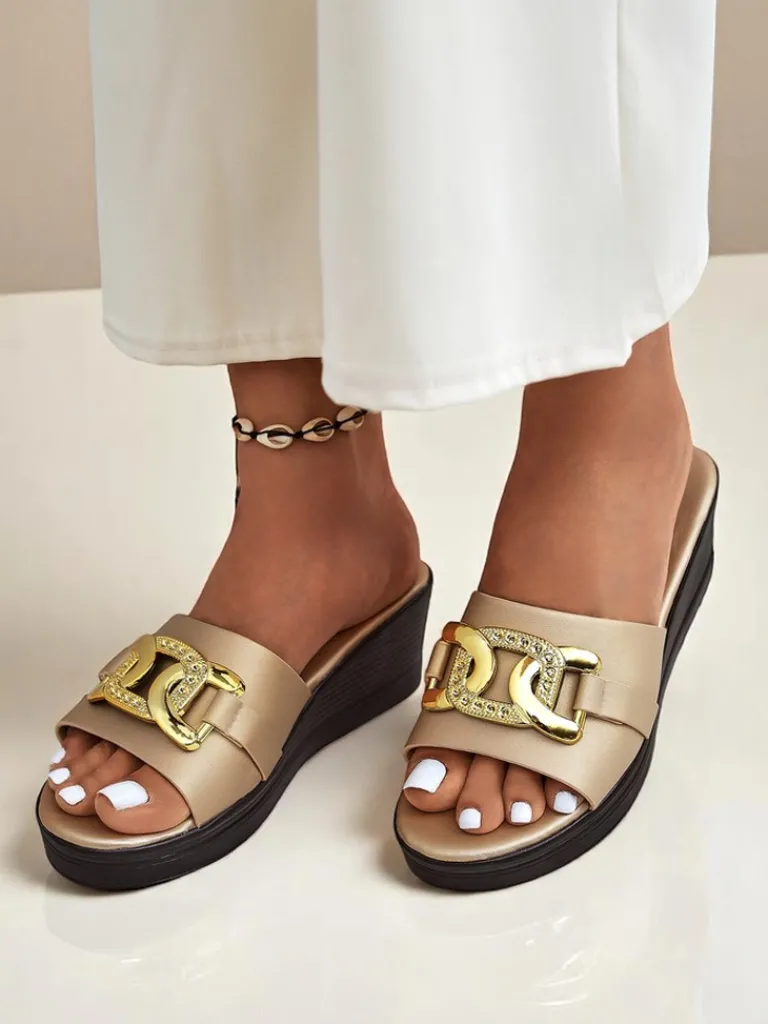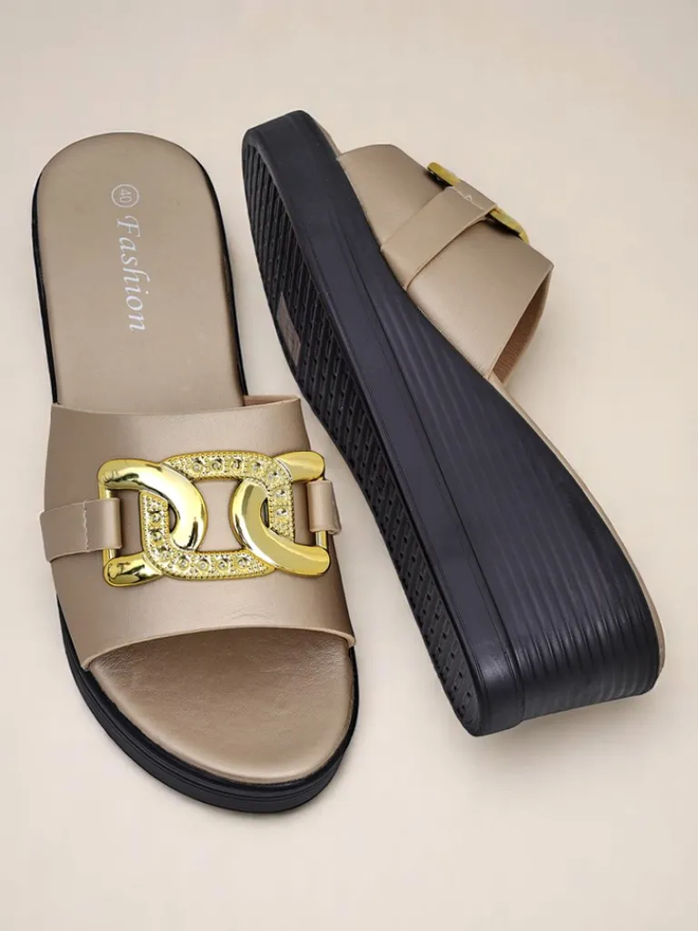 - Nolia to stylowe klapki z eko skóry na koturnie, z metalicznym wykończeniem i subtelną złotą ozdobą. Idealne na lato – łączą elegancję z wygodą na co dzień.