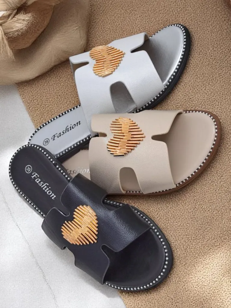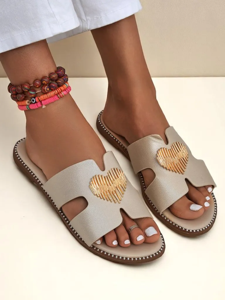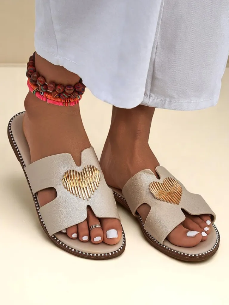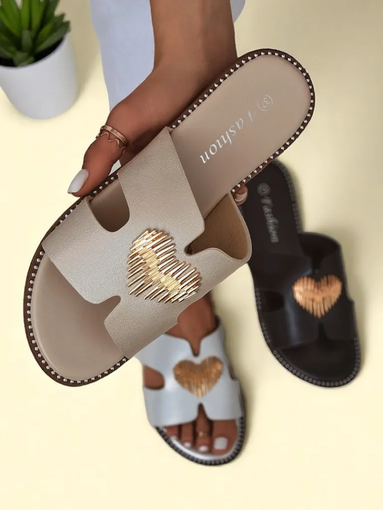 - Klapki z eko skóry z płaską podeszwą i złotą ozdobą w kształcie serca. Styl i wygoda w jednym — idealne na lato, spacer po mieście i lekkie, kobiece stylizacje.